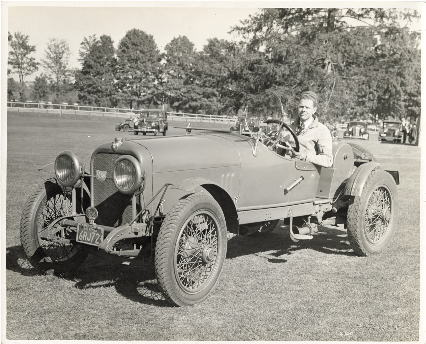 Driver posing in Mercer racecar