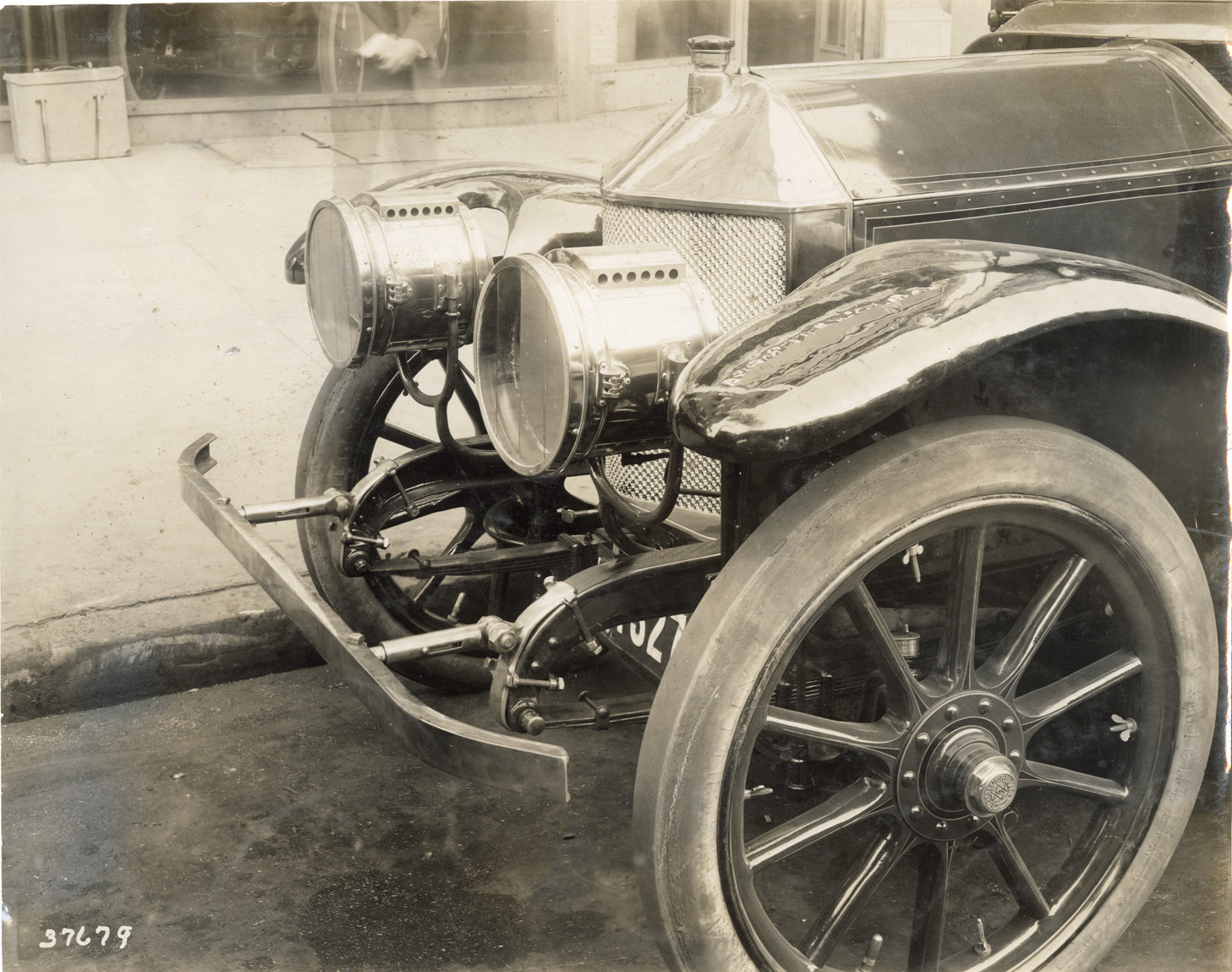 Close-up view of the front end of a Metallurgique car. Stamped on back: "Spooner & Wells, Inc., photographers, telephones 3472-3473 Columbus, 1931 Broadway, New York." Handwritten on back: "Metallurgique, ca. 1912."