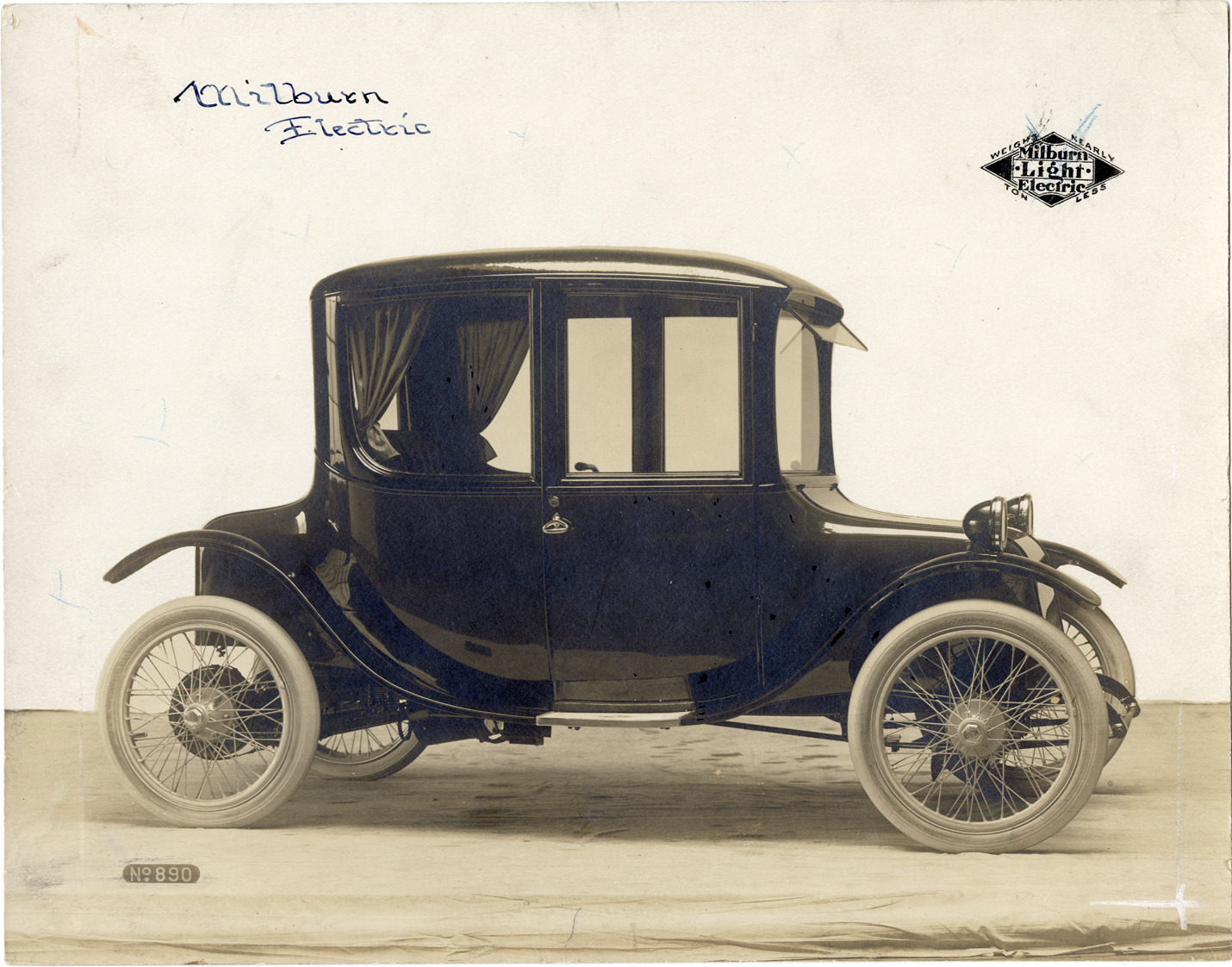 View of a Milburn Electric car. Printed on front: "Milburn Light Electric. Weighs nearly ton less. No. 890." Handwritten on front: "Milburn Electric." Handwritten on back: "Milburn Light Electric brougham. Wheelbase 105". Comfortably seats 4 people. Speed six to twenty-three miles per hour. Price $1685.00 F.O.B. Toledo."