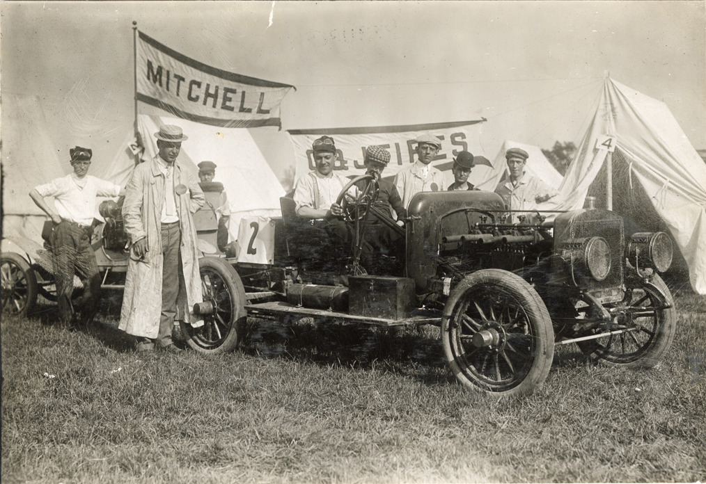 View of driver and onlookers posing with 1907 Mitchell car no. 2. Tents and "Mitchell" banner in background. Stamped on back: "Spooner and Wells, 1931 Broadway, New York, duplicates any time, enlargements all sizes, tel. 3472-3473 Col., credit appreciated." Handwritten on back: "Mitchell, 1907."