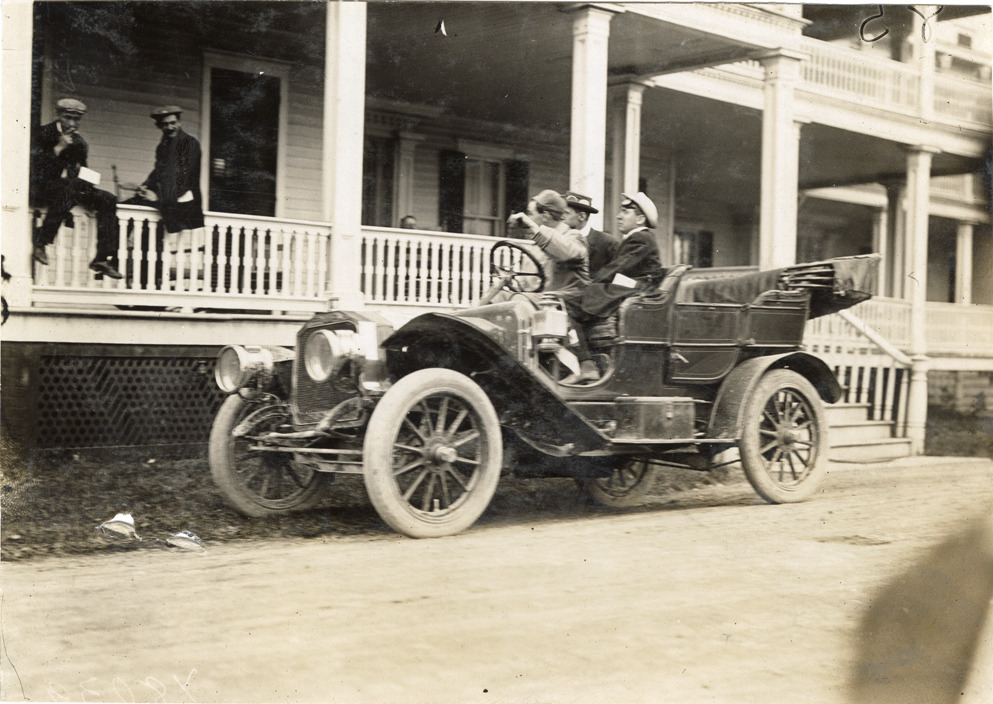 View of motorists in Mitchell car in front of the Grant Hotel. Stamped on back: "Spooner & Wells, Inc., photographers, telephones 3472-3473 Columbus, 1931 Broadway, New York." Handwritten on back: "Mitchell, ca. 1909. Mitchell at Grant Hotel, Catskills."