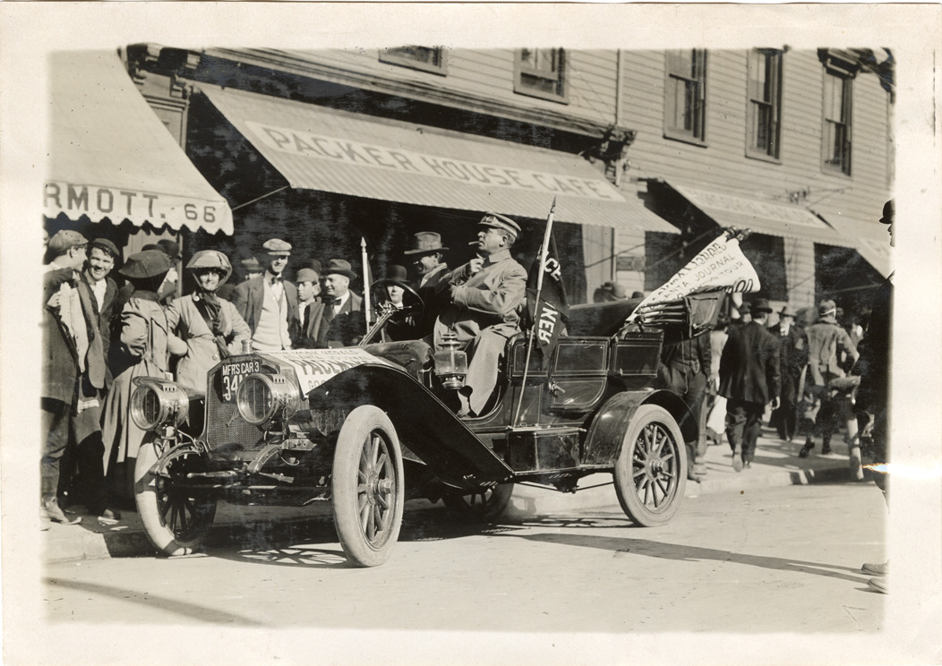 View of motorists in Mitchell pacemaker car at Perth Amboy, New Jersey during the 1909 New York to Atlanta Good Roads Tour. Spectators and Packer House Cafe in background. Stamped on back: "Photo by Spooner & Wells, Inc. 1931 Broadway, N.Y." Handwritten on back: "Mitchell, ca. 1909."