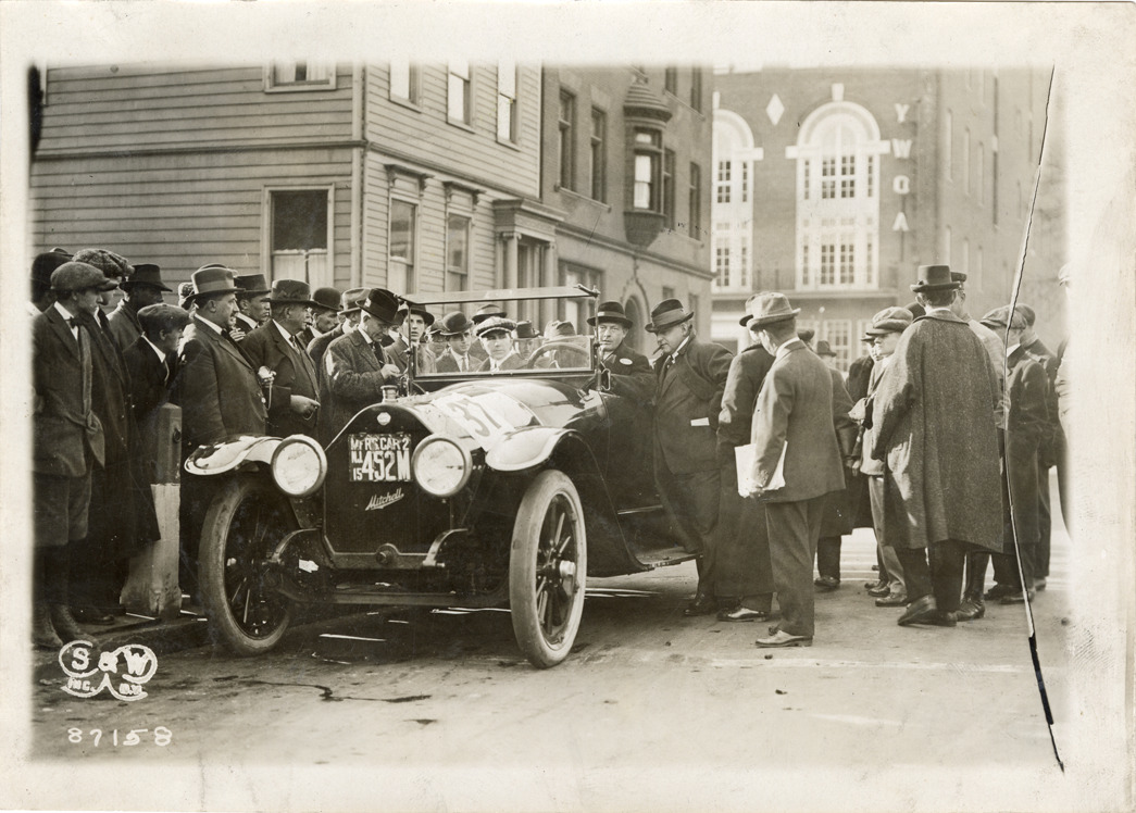 Favorite this☆ Motorists in Mitchell automobile Description: View of motorists in Mitchell car no. 37, surrounded by onlookers. Printed on front: "S&W, Inc. N.Y." Handwritten on back: "Mitchell, ca. 1915." Details Resource ID: na045934 Creator: Spooner & Wells Subject: Mitchell automobiles Photographers--New York (State)--New York Photographic prints Date Issued: 1915 Format: 1 photographic print ; 5 x 7 in. Member of: National Automotive History Collection Lazarnick Collection Filing Location: General photograph files, Mitchell Rights: Physical rights are retained by DPL. Copyright is retained in accordance with U.S. copyright laws.