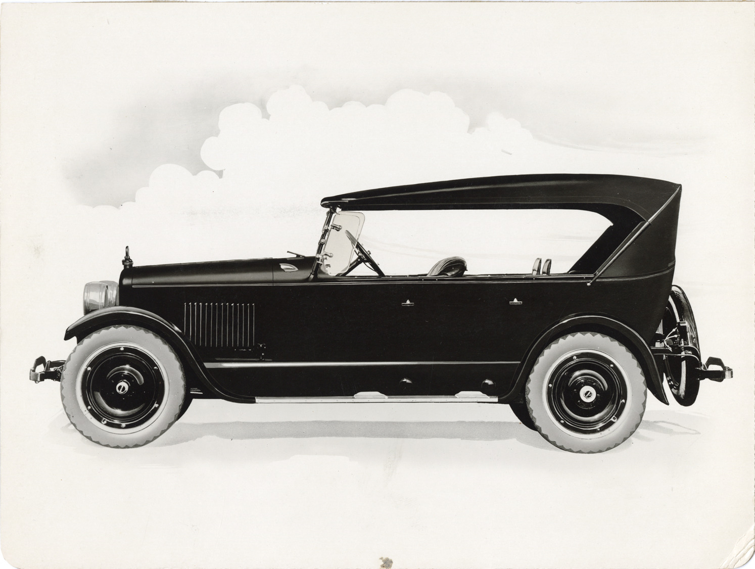 View of a Mitchell F-50 car. Label on back: "The new F-50 Mitchell, 7-pass. phaeton deluxe. 3-1/2" x 5", 50 h.p. 127 in. wheelbase, 32 x 4-1/2" cord tires. Mitchell Motors Company, Incorporated. Racine, Wisconsin." Handwritten on back: "Mitchell."