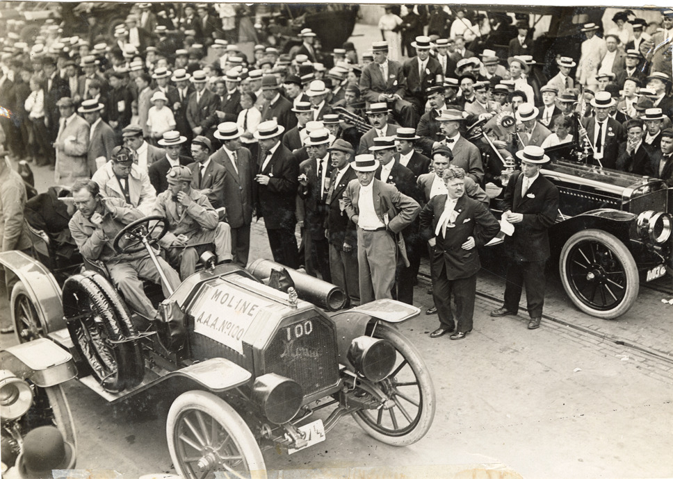 View of C.H. Vandervoort and motorists in Moline car no. 100 during the 1909 Glidden Tour. Spectators in background. Stamped on back: "Spooner & Wells, Inc., photographers, telephones 3472-3473 Columbus, 1931 Broadway, New York." Handwritten on back: "Moline with Vandervoort at wheel, Glidden, 1909."