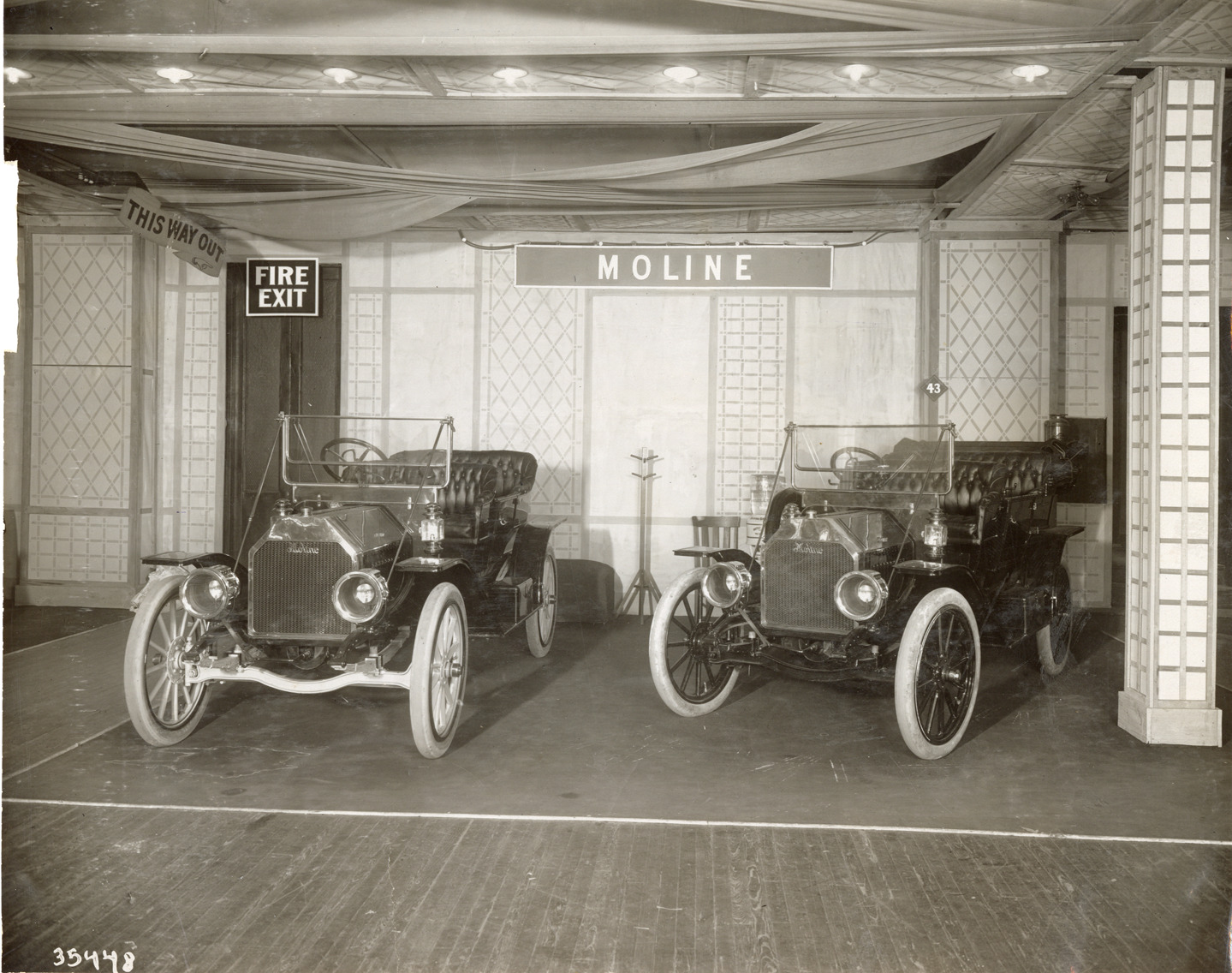 View of 1910 Moline cars on display at trade show. "Moline" and "Fire exit, this way out" signs in background. Stamped on back: "Spooner & Wells, Inc., photographers, telephones 3472-3473 Columbus, 1931 Broadway, New York." Handwritten on back: "Moline, 1910."
