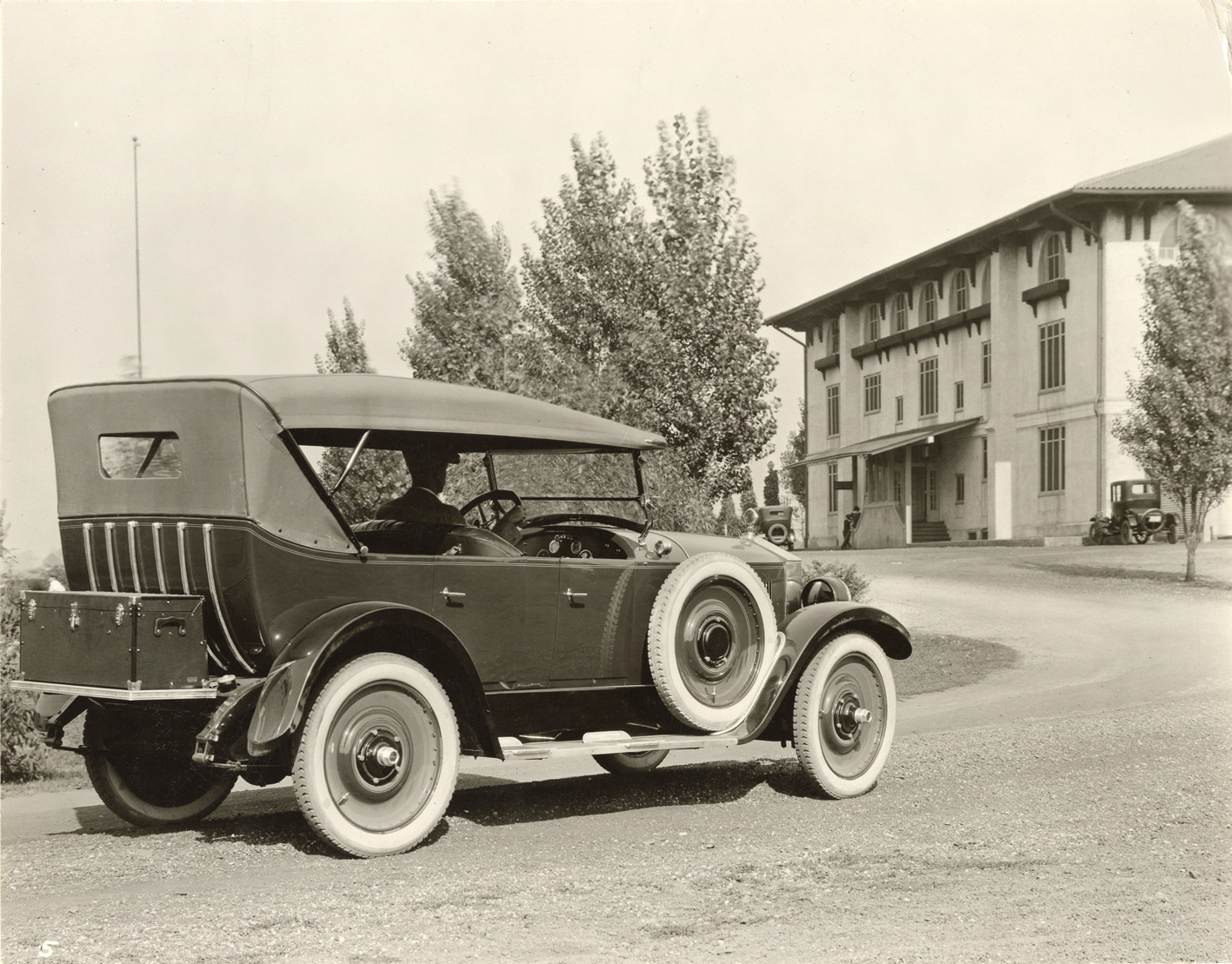 View of a motorist in a Moon 6-40 sport touring car. Stamped on back: "Eugene Taylor, photographer. 806-8 Chestnut Street, Garfield 4668. St. Louis." Handwritten on back: "Moon 6-40 sport touring, $1445, F.O.B. St. Louis."