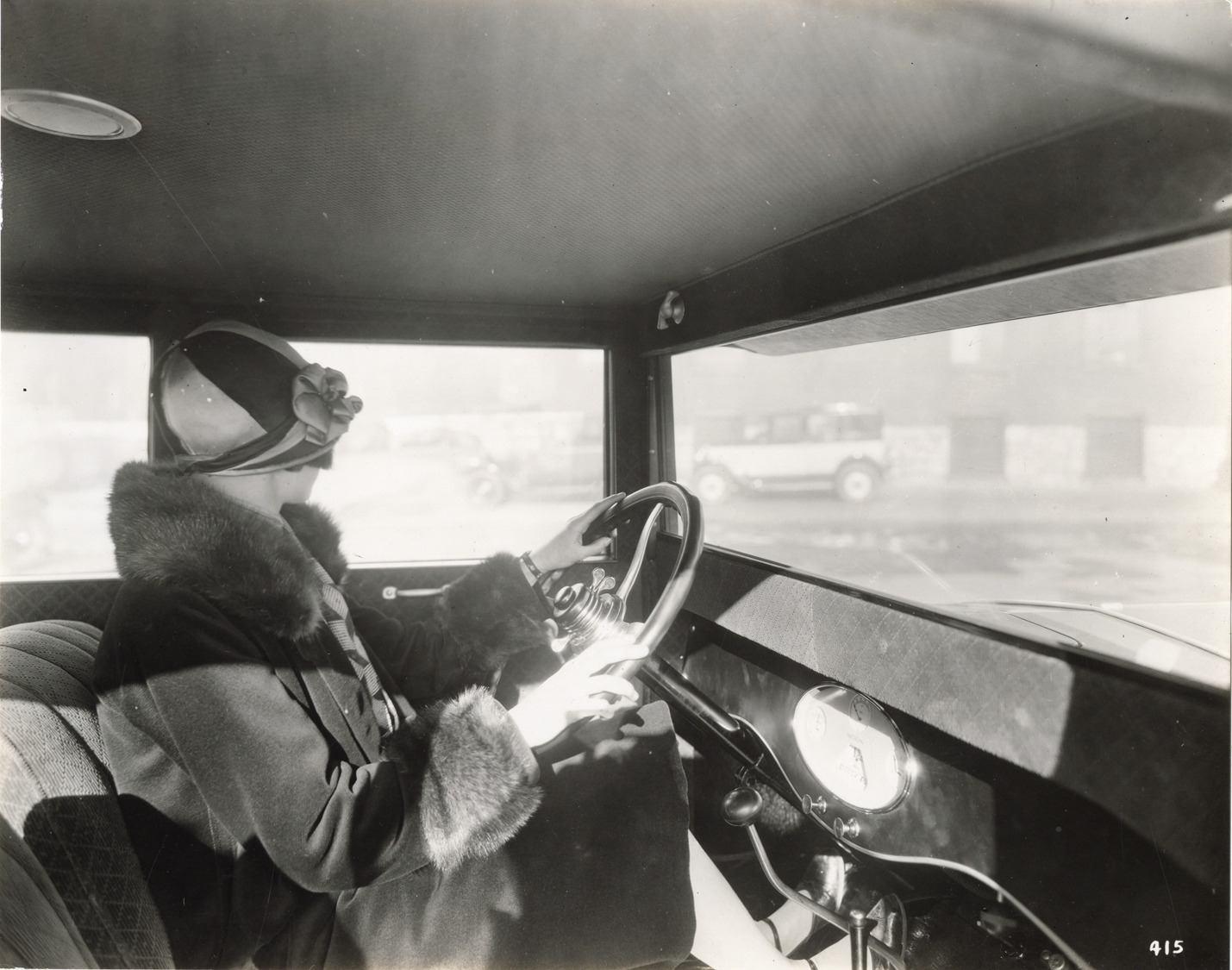 Interior view of a woman motorist posing in a Moon car. Label on back: "Figure 4. View from the drivers seat of a previous model Moon body shows a much wider front pillar post therefore a larger 'blind spot' than on the new patented safety vision composite wood and steel bodies with their narrow composite wood and steel construction." Handwritten on back: "Moon."