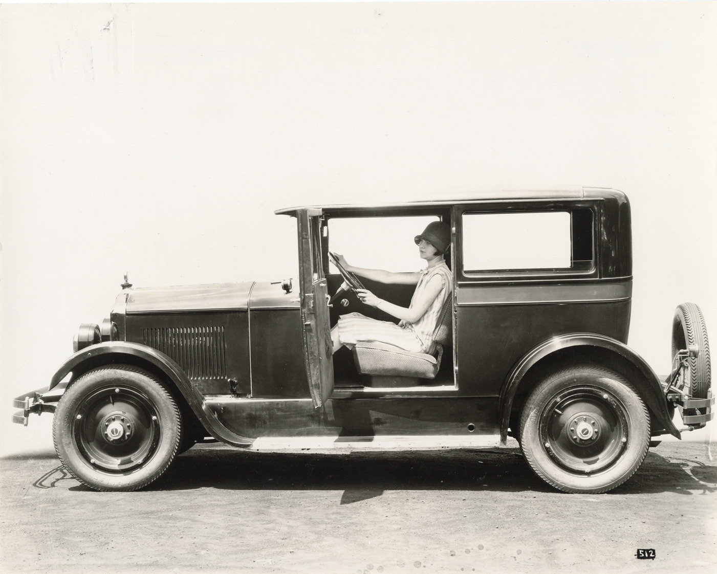 View of a woman motorist posing in a 1927 Moon 6-60 coach. Driver's side door is open. Typed on back: "Moon 6-60 coach." Stamped on back: "Eugene Taylor, photographer. 806-8 Chestnut Street, Garfield 4668. St. Louis." Handwritten on back: "Moon, 1927."