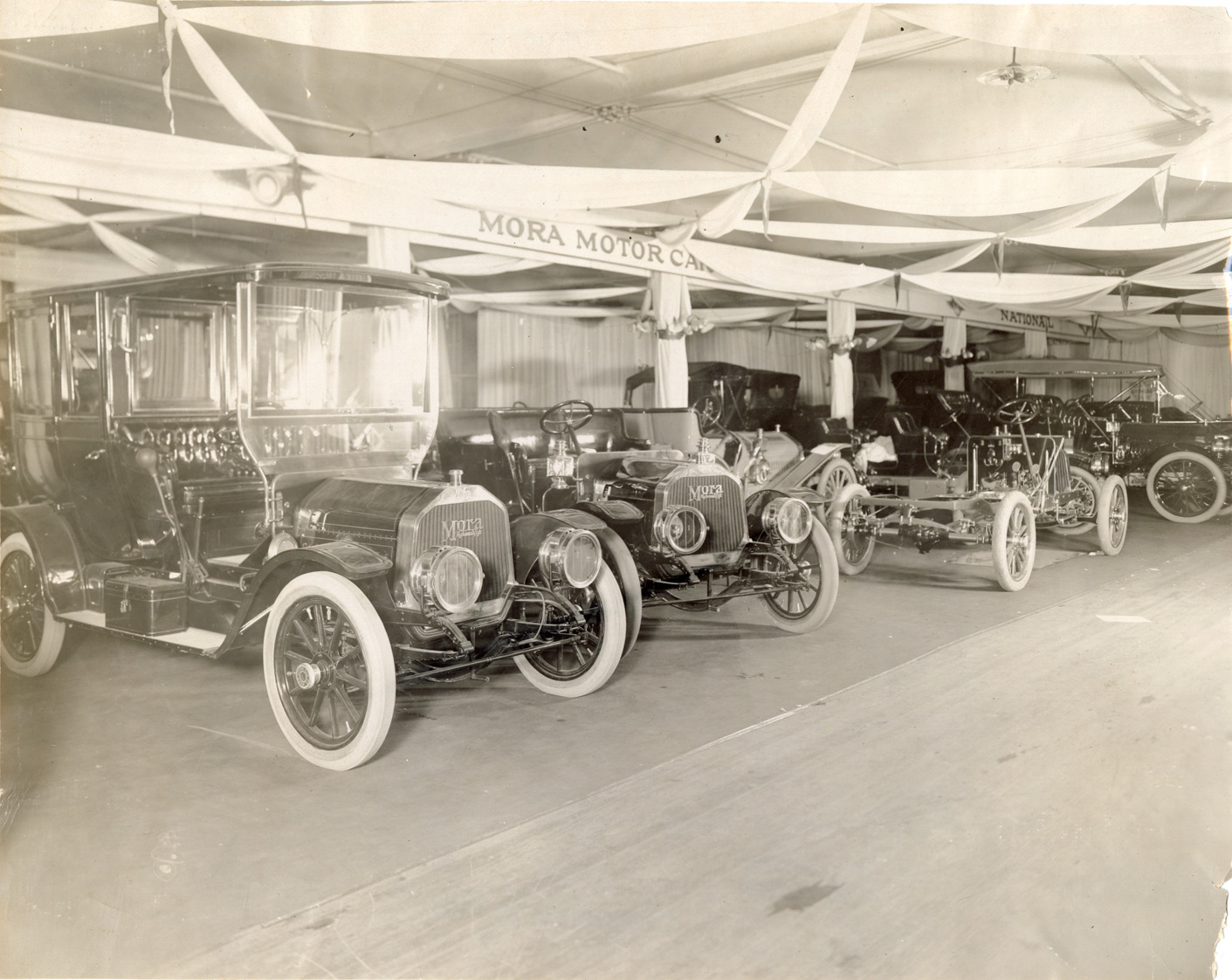 View of 1909 Mora cars on display at trade show. "Mora Motor Car" sign in background. Handwritten on back: "Mora, 1909." Stamped on back: "Spooner & Wells, Inc., photographers, telephones 3472-3473 Columbus, 1931 Broadway, New York." Handwritten on back: "Mora, 1909."
