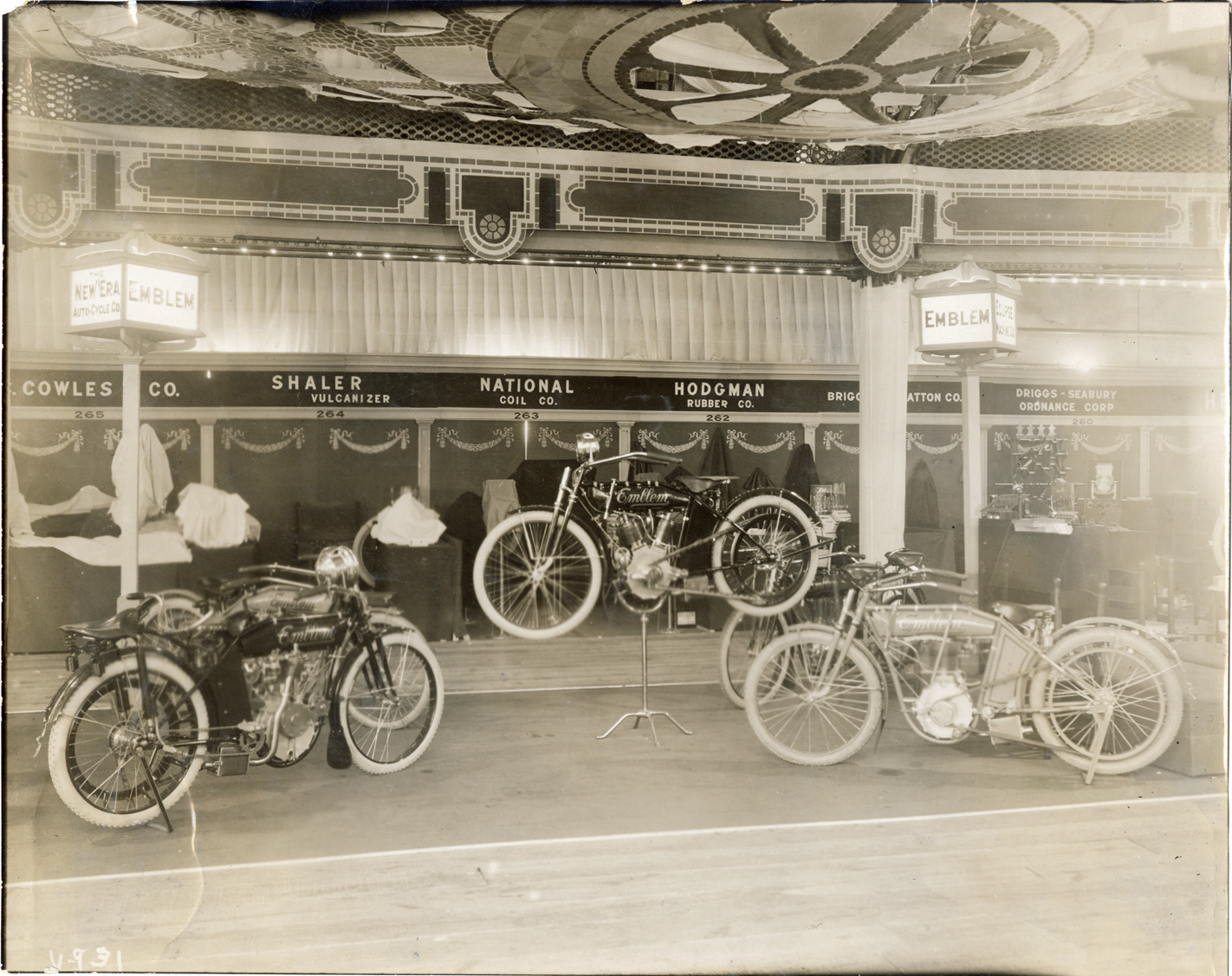 View of a Emblem motorcycles on display at trade show. "Emblem motorcycles" signs in background. Stamped on back: "Spooner & Wells, Inc., photographers, telephones 3472-3473 Columbus, 1931 Broadway, New York." Handwritten on back: "Emblem, ca. 1911."