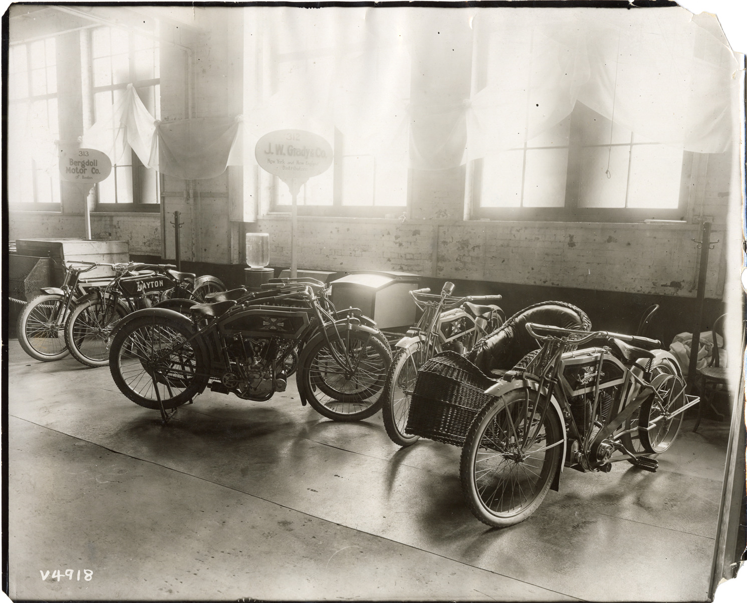 Favorite this☆ Excelsior and Dayton motorcycles at trade show Description: View of Excelsior and Dayton motorcycles on display at trade show. "J.W. Grady & Co., New York and New England distributors" sign in background. Handwritten on back: "Excelsior, c.1912." Details Resource ID: na046072 Subject: Motorcycles Davis Sewing Machine Company Excelsior Supply Company Trade shows Photographic prints Date Issued: 1912 (year approximate) Format: 1 photographic print ; 8 x 10 in. Member of: National Automotive History Collection Lazarnick Collection Filing Location: General photograph files, Motorcycles--Excelsior Rights: Physical rights are retained by DPL. Copyright is retained in accordance with U.S. copyright laws.