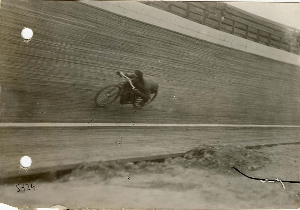 View of a motorcyclist racing motorcycle on track during the 1912 Federation of American Motorcyclists meet in Columbus, Ohio. Handwritten on back: "Federation American Motorcyclists, Columbus, Ohio, 1912."