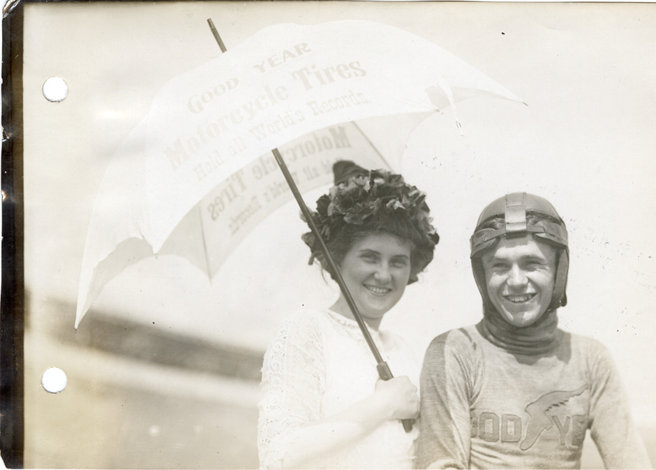 Close-up view of a woman and motorcyclist posing under an umbrella during the 1912 Federation of American Motorcyclists meet in Columbus, Ohio. "Goodyear motorcycle tires hold all world's records" is lettered on umbrella. Stamped on back: "Spooner & Wells, Inc., photographers, 1231 Woodward Ave., Detroit, Mich., telephone North 1745." Handwritten on back: "Federation American Motorcyclists, Columbus, Ohio, 1912."