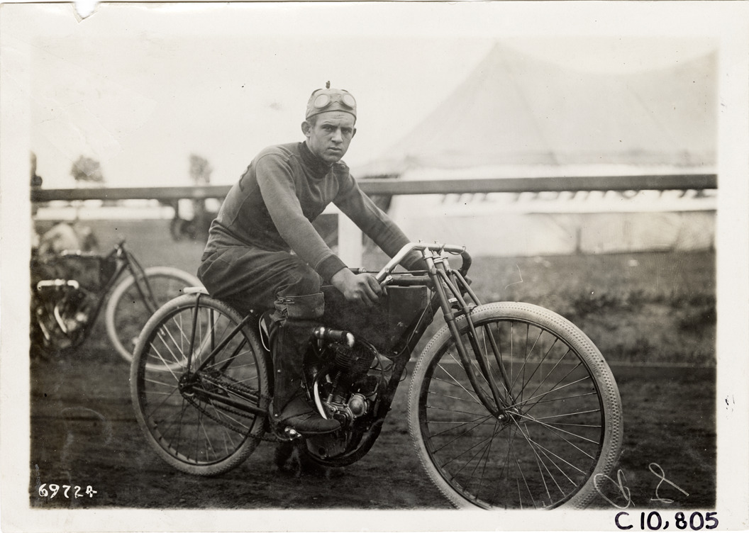 Motorcyclist posing on motorcycle, 1911 Federation of American Motorcyclists races, Fort Erie, Ontario