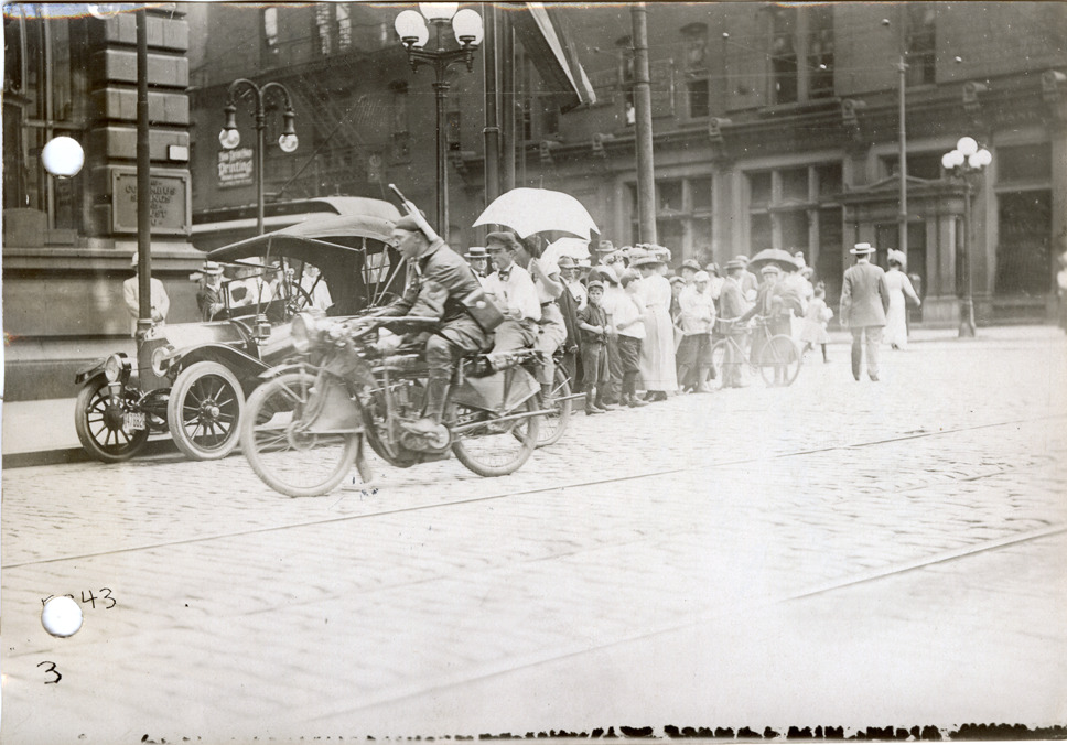 Motorcyclists traveling on street, 1912 Federation of American Motorcyclists meet