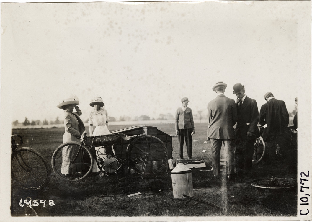 Men and women with Emblem motorcycle, 1911 Federation of American Motorcyclists races, Fort Erie, Ontario