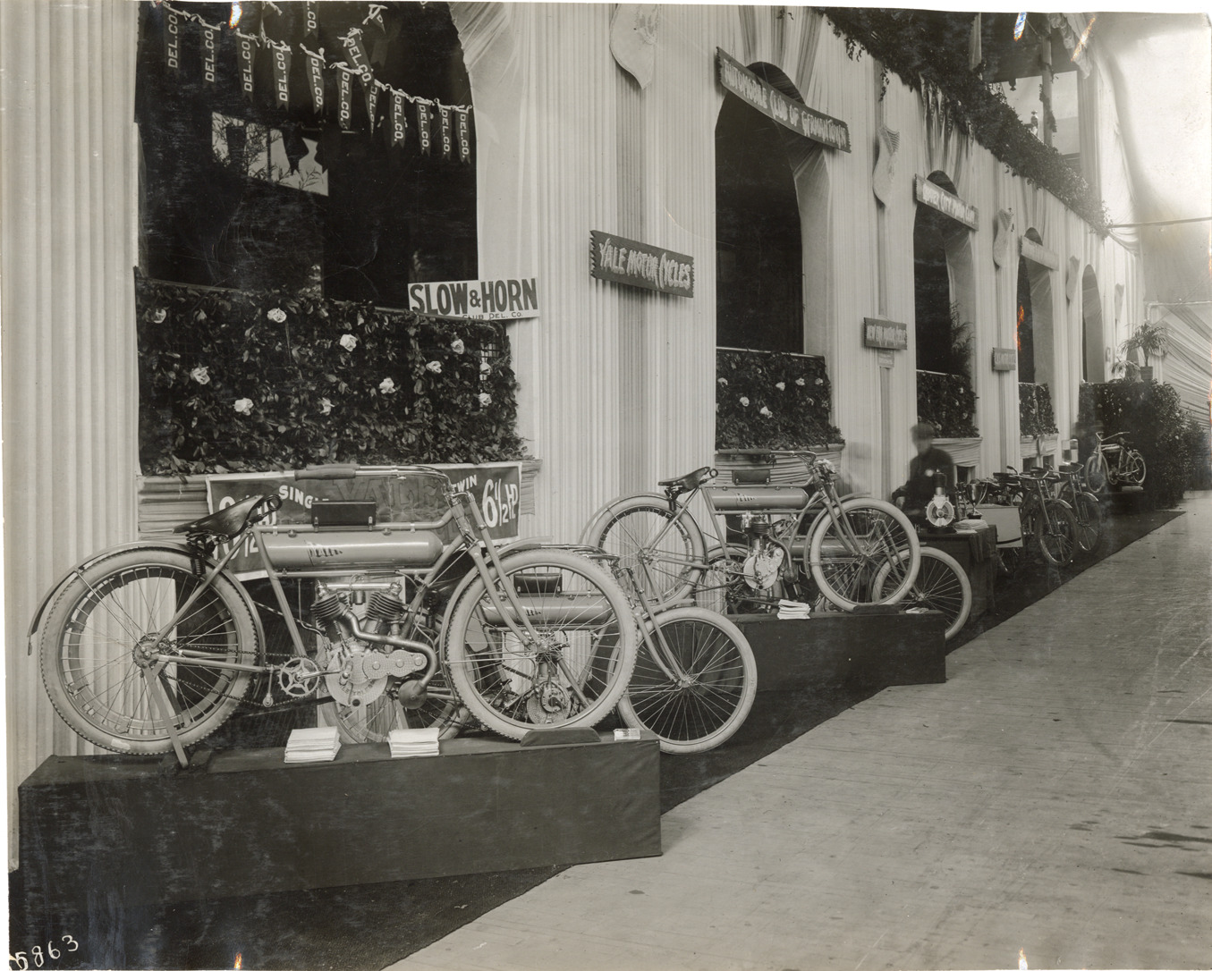 Favorite this☆ Yale motorcycles on display at trade show Description: View of Yale motorcycles on display at trade show. Stamped on back: "Spooner & Wells, Inc., photographers, telephones 3472-3473 Columbus, 1931 Broadway, New York." Handwritten on back: "Yale, ca. 1910." Details Resource ID: na046114 Creator: Spooner & Wells Subject: Motorcycles Consolidated Manufacturing Company Trade shows Photographers--New York (State)--New York Photographic prints Date Issued: 1910 (year approximate) Format: 1 photographic print ; 7.25 x 9 in. Member of: National Automotive History Collection Lazarnick Collection Filing Location: General photograph files, Motorcycles--Yale Rights: Physical rights are retained by DPL. Copyright is retained in accordance with U.S. copyright laws.