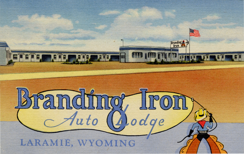View of the Branding Iron Auto Lodge in Laramie, Wyoming. Card also depicts a cowboy with a lasso. Printed on front: "Branding Iron Auto Lodge, Laramie, Wyoming." Printed on back: "On U.S. Highway 30. 20 units. New ultra modern rooms. Individual tile showers. Steam heat. Finest beds. Near snowy range, the West's greatest winter sports area. 3 ski tows. Trout fishing. Camping and picnic grounds. Genuine Curteich-Chicago 'C.T. Art-Colortone' post card (reg. U.S. Pat. Off.)"