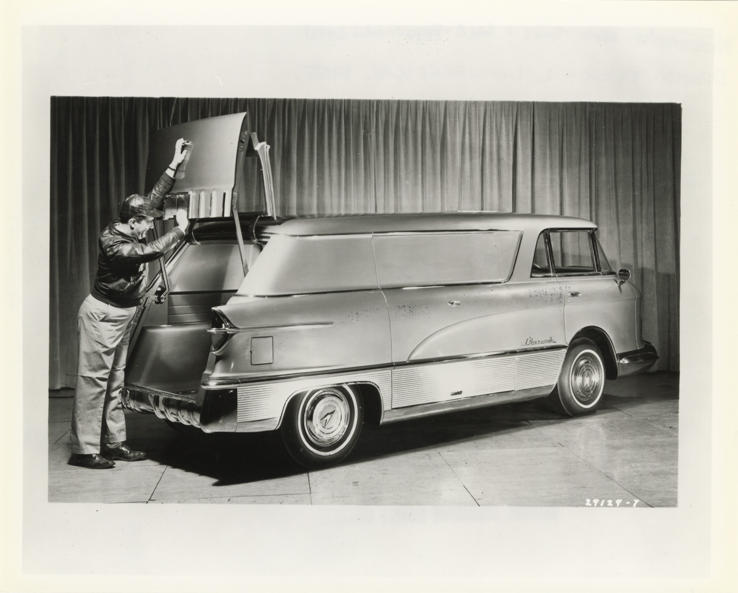 View of a man lifting the tailgate of a 1955 GMC L'Universelle experimental truck. Handwritten on back: "Dream truck. L'Universelle, 1955."