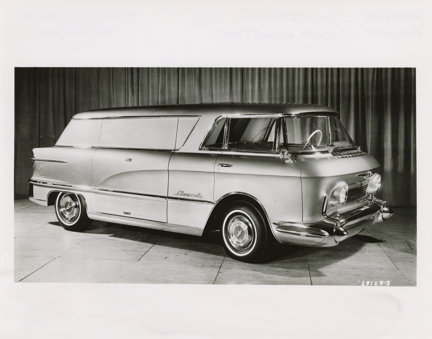 View of a 1955 GMC L'Universelle experimental truck. Label on back: "Among the galaxy of experimental cars at the General Motors Powerama in Chicago will be this GMC 'dream truck' L'Universelle, which has created a sensation at public showings since its introduction in January. Although still in the 'show truck' category, plans are being made to put the revolutionary new vehicle into production. From: GMC Truck & Coach Division. Pontiac, Michigan." Handwritten on back: "Concept dream truck. L'Universelle, 1955."