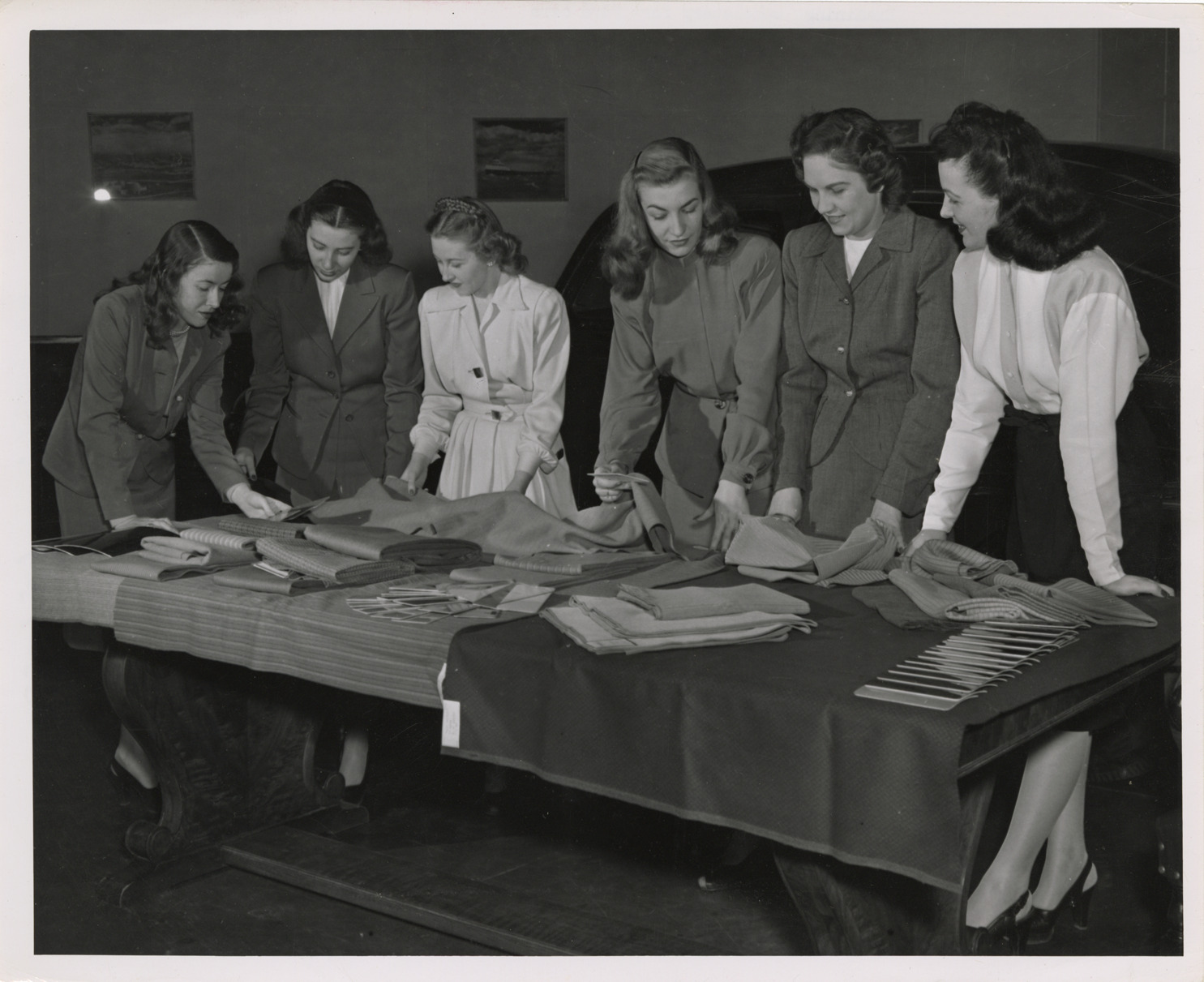 View of women designers examining upholstery samples for Ford cars. Typed on back: "Examining upholstery for Ford cars." Stamped on back: "From Ford News Bureau. Administration Building. Dearborn, Michigan."