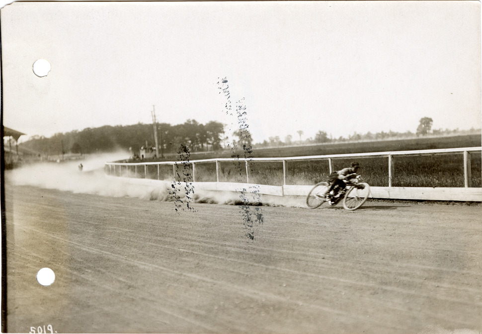 View of a motorcyclist racing motorcycle on track during the 1912 meet held at the Michigan State Fairgrounds. Handwritten on back: "Motorcycle race at State Fair Grounds, 1912."