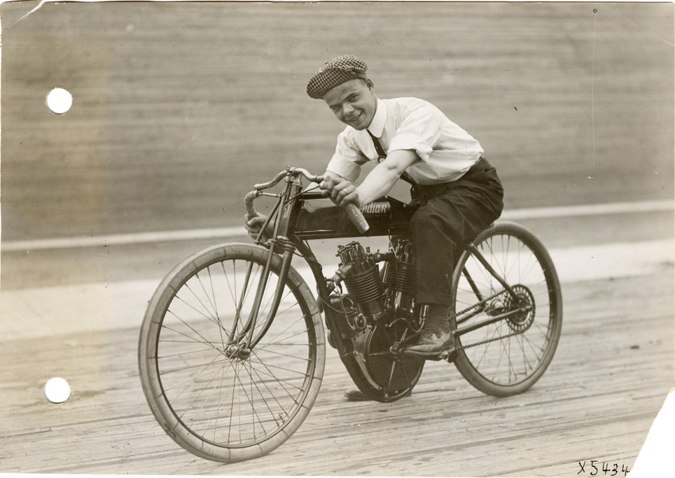 George Squires posing on Indian motorcycle, 1912 Federation of American Motorcyclists meet