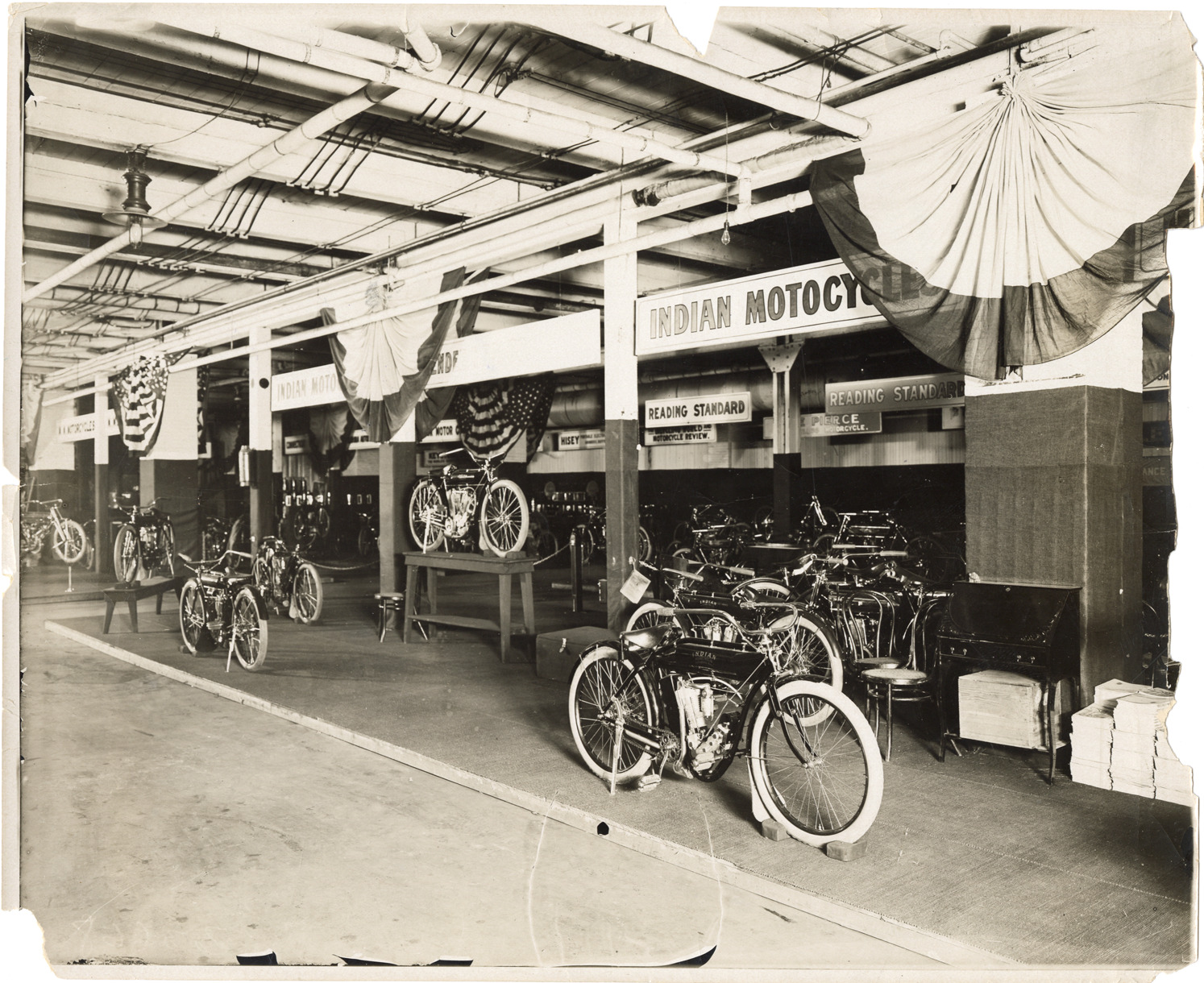 Favorite this☆ Indian motorcycles on display at trade show Description: View of Indian motorcycles on display at trade show. "Indian motorcycles" sign in background. Stamped on back: "Spooner & Wells, Inc., photographers, telephones 3472-3473 Columbus, 1931 Broadway, New York." Handwritten on back: "Indian, app. 1909." Details Resource ID: na046160 Creator: Spooner & Wells Subject: Indian motorcycle Trade shows Photographers--New York (State)--New York Photographic prints Date Issued: 1909 (year approximate) Format: 1 photographic print ; 8 x 10 in. Member of: National Automotive History Collection Lazarnick Collection Filing Location: General photograph files, Motorcycles--Indian Rights: Physical rights are retained by DPL. Copyright is retained in accordance with U.S. copyright laws.