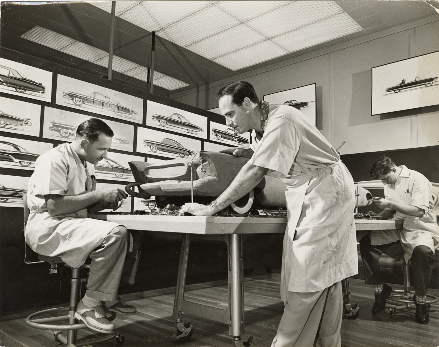 View of modelers La Marr Ferguson, Lawrence R. Wilson and Robert E. Genslak working on clay model of a Ford car. Label on back: "Clay models blossom only from accepted sketches. Sometimes hundreds of futuristic renderings are drawn before one is approved for a 3/8th scale clay reproduction, such as the model being fashioned by Advanced Styling Modelers La Marr Ferguson, Lawrence R. Wilson and Robert E. Genslak. From News Department, Ford Motor Company, Dearborn, Michigan." Stamped on back: "News photo by Robert Boram. Ford Motor Company." Handwritten on back: "Design--Ford."