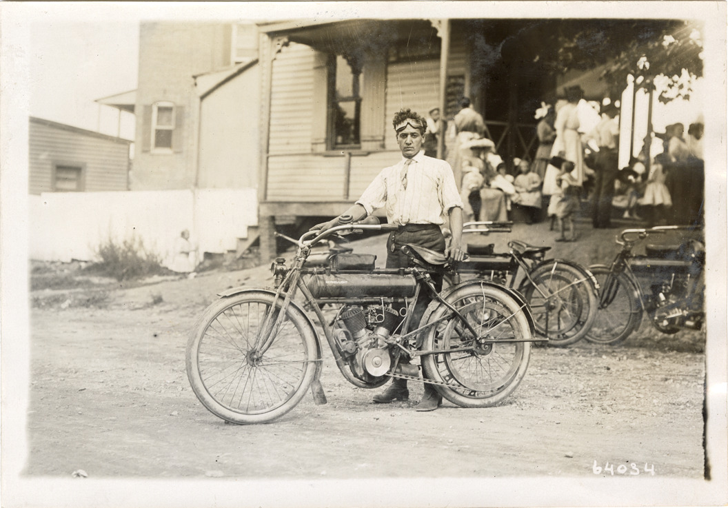 View of a motorcyclist posing with a Merkel motorcycle. Stamped on back: "Spooner & Wells, Inc., photographers, telephones 3472-3473 Columbus, 1931 Broadway, New York." Handwritten on back: "Merkel, ca. '10."