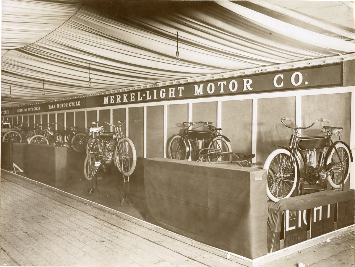 Favorite this☆ 1909 Merkel motorcycles at trade show Description: View of 1909 Merkel motorcycles on display at trade show. "Merkel-Light Motor Co." sign in background. Stamped on back: "Photo by N. Lazarnick, 29 West 42nd Street, N.Y., tel. 594 Bryant." Handwritten on back: "Merkel, '09." Details Resource ID: na046167 Creator: Lazarnick, Nathan Subject: Motorcycles Merkel-Light Motor Company Trade shows Photographers--New York (State)--New York Photographic prints Date Issued: 1909 (year approximate) Format: 1 photographic print ; 6 x 8 in. Member of: National Automotive History Collection Lazarnick Collection Filing Location: General photograph files, Motorcycles--Merkel Rights: Physical rights are retained by DPL. Copyright is retained in accordance with U.S. copyright laws.