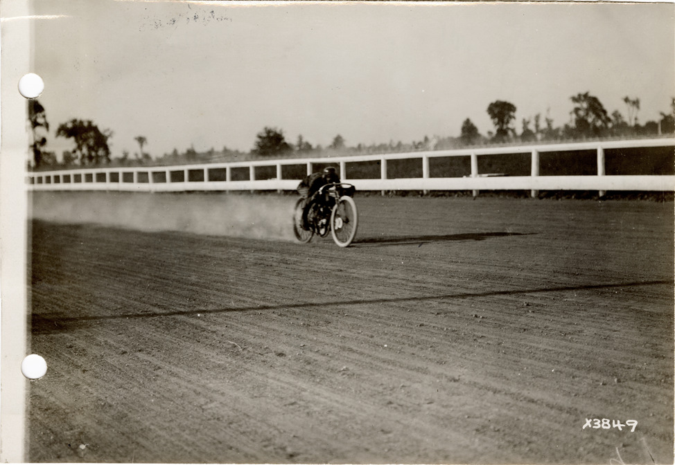 W.J. Tuebner racing motorcycle on track, 1911 Michigan State Fairgrounds meet