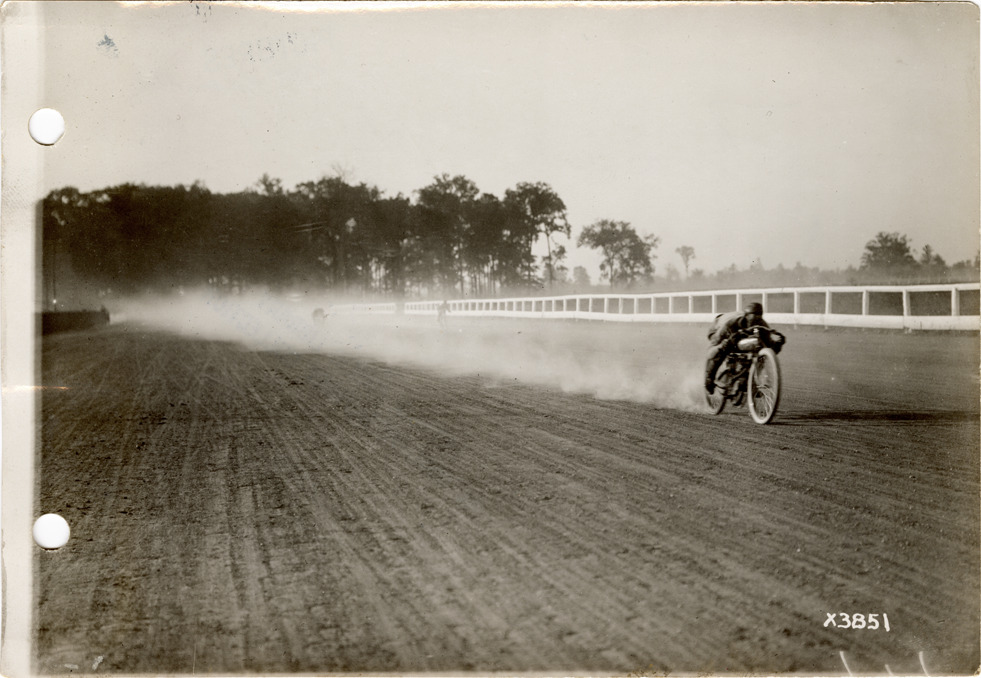 View of motorcyclist Frank Hart racing motorcycle on track during the 1911 meet held at the Michigan State Fairgrounds. Stamped on back: "Spooner & Wells, Inc., photographers, 1231 Woodward Ave., Detroit, Mich., telephone North 1745." Handwritten on back: "Frank Hart."