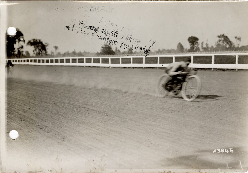 View of motorcyclist Frank Hart racing motorcycle on track during the 1911 meet held at the Michigan State Fairgrounds. Stamped on back: "Spooner & Wells, Inc., photographers, 1231 Woodward Ave., Detroit, Mich., telephone North 1745." Handwritten on back: "Frank Hart going some. Detroit, Sept. 4, 1911."