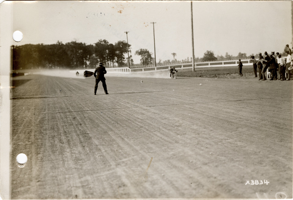 View of flagman at finish line of 10 mile race during the 1911 meet held at the Michigan State Fairgrounds. Motorcycles in background. Stamped on back: "Spooner & Wells, Inc., photographers, 1231 Woodward Ave., Detroit, Mich., telephone North 1745." Handwritten on back: "Finish of the 10 mile open, Detroit, Sept. 4, 1911. Motorcycle race."