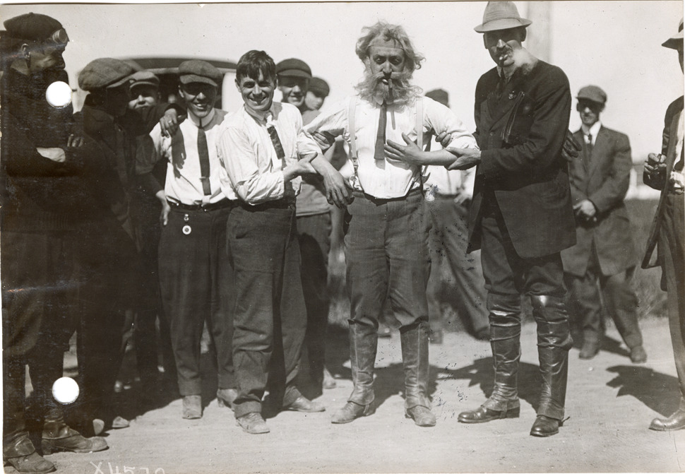 View of two motorcyclists and group of unidentified men posing for camera during the 1912 meet held at the Michigan State Fairgrounds. Handwritten on back: "Taken at State Fair Grounds, 5/30/12."