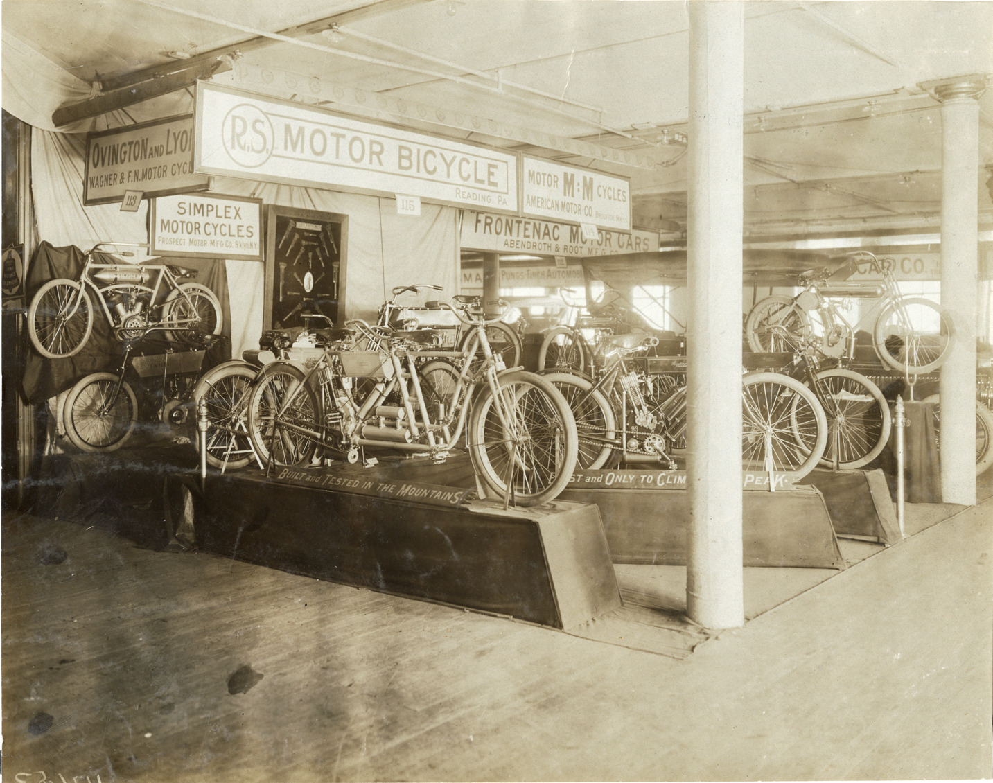 View of 1907 Reading-Standard motorcycles and other motorcycles on display at trade show. "R.S. Motor Bicycle, Reading, Pa." sign in background. Stamped on back: "Spooner and Wells, 1931 Broadway, New York, duplicates any time, enlargements all sizes, tel. 3472-3473 Col., credit appreciated." Handwritten on back: "Reading-Standard, 1907."