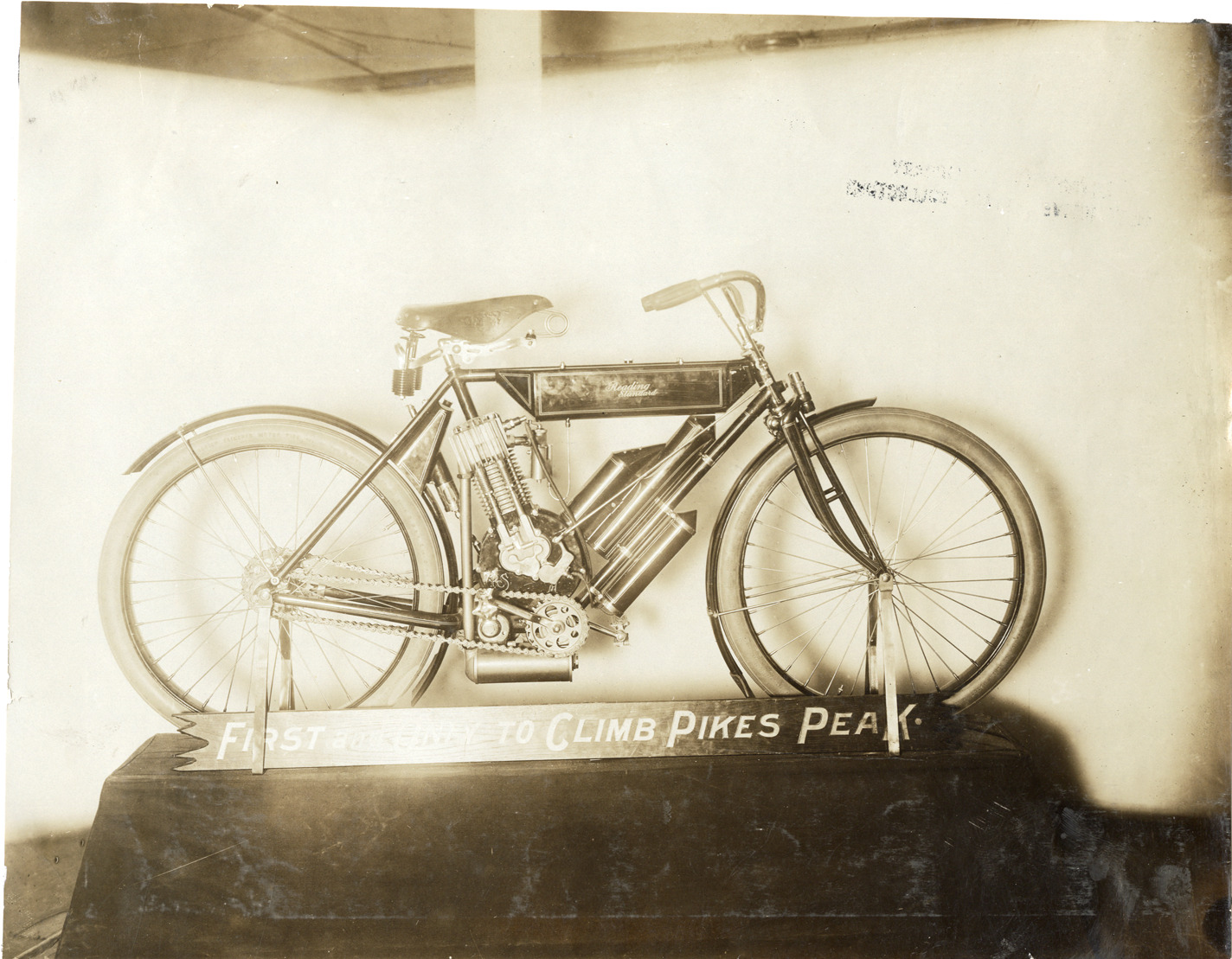 View of a 1907 Reading-Standard motorcycle. Sign reads: "First and only to climb Pikes Peak." Stamped on back: "Spooner and Wells, 1931 Broadway, New York, duplicates any time, enlargements all sizes, tel. 3472-3473 Col., credit appreciated." Handwritten on back: "Reading-Standard, 1907."