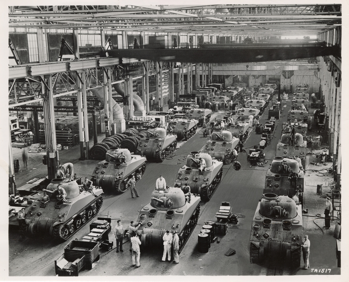Bird's-eye view of workers assembling U.S. Army tanks at an unidentified plant.
