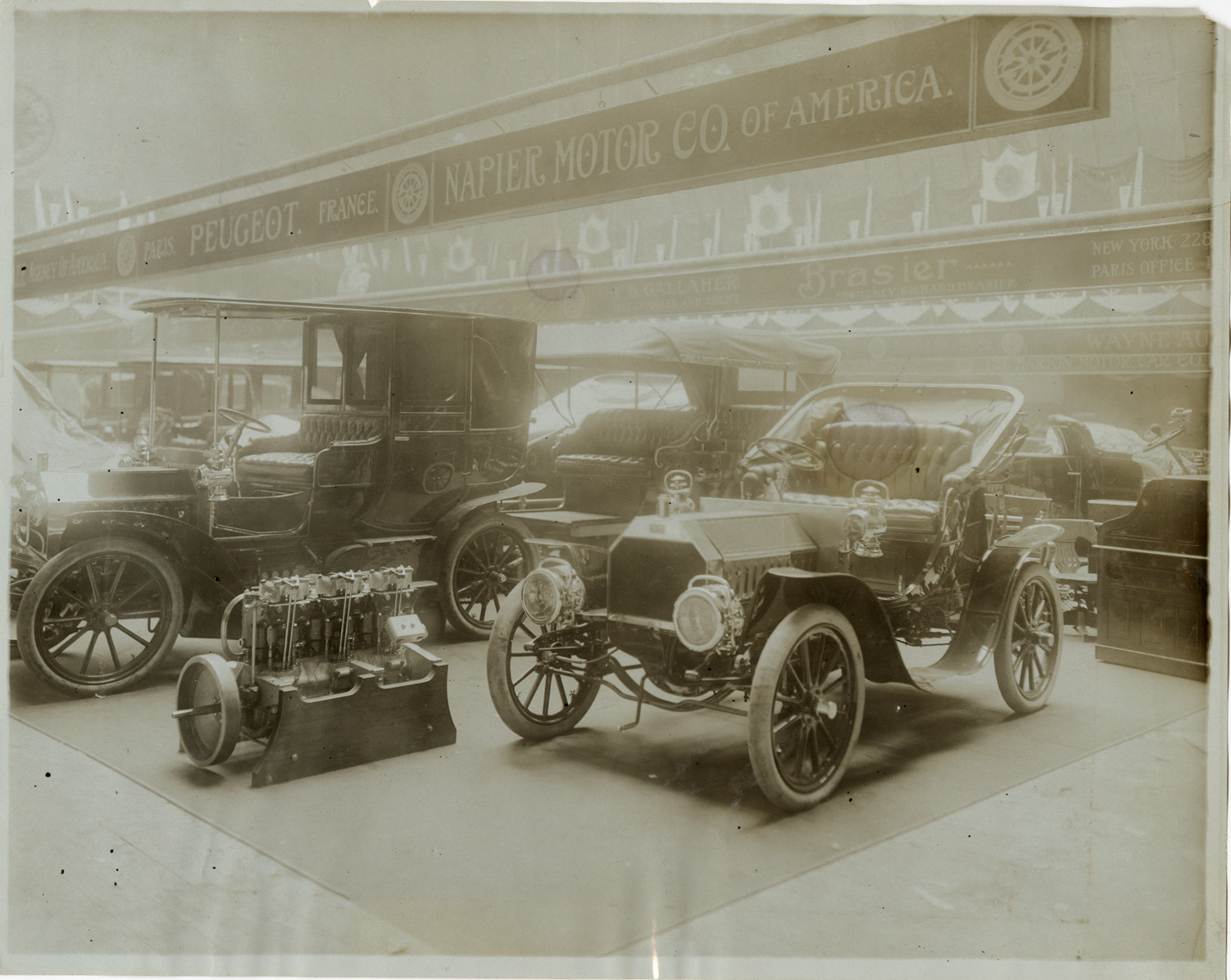 View of 1906 Napier cars and engine on display at trade show. "Napier Motor Co. of America" sign is displayed overhead. Stamped on back: "Photo by F. Ed. Spooner, 1536 B'way, telephone 6536-38th St., New York, N.Y." Handwritten on back: "Napier, 1906."