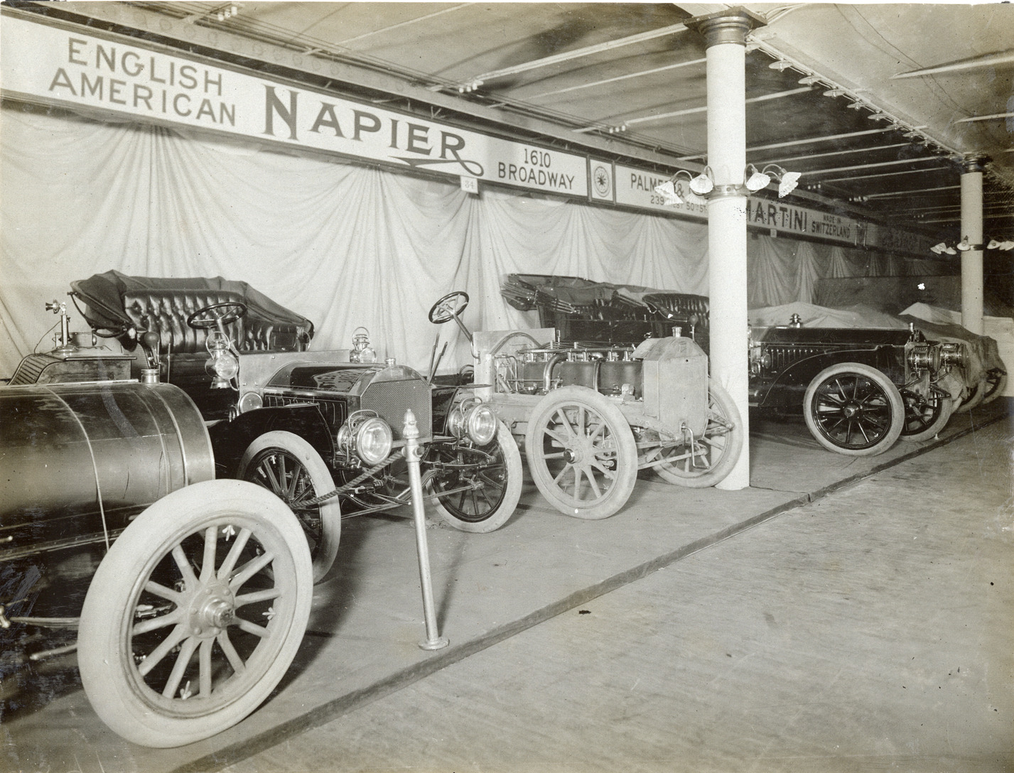 Favorite this☆ 1907 Napier automobiles and chassis at trade show Description: View of 1907 Napier cars and chassis on display at trade show. "English, American Napier, 1610 Broadway" sign is displayed in background. Handwritten on back: "Napier, 1907." Details Resource ID: na046257 Subject: Napier automobiles Automobiles--Chassis Trade shows Photographic prints Date Issued: 1907 (year approximate) Format: 1 photographic print ; 7.25 x 9.5 in. Member of: National Automotive History Collection Lazarnick Collection Filing Location: General photograph files, Napier Rights: Physical rights are retained by DPL. Copyright is retained in accordance with U.S. copyright laws.