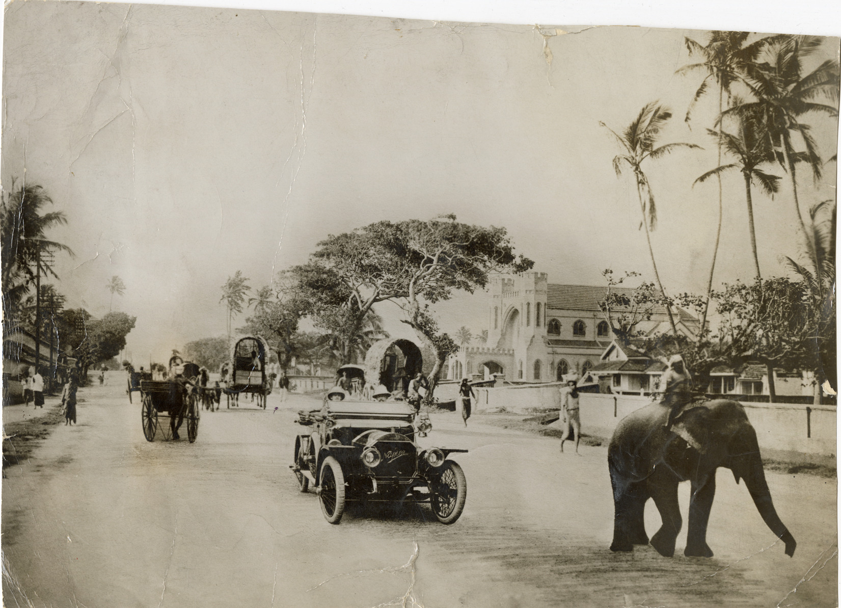 View of motorists traveling in a Napier car on street in Burma. Elephant in foreground; buildings, pedestrians and other vehicles in background. Label on back: "Typical Burmese road scene." Handwritten on back: "Napier, ca. 1910."