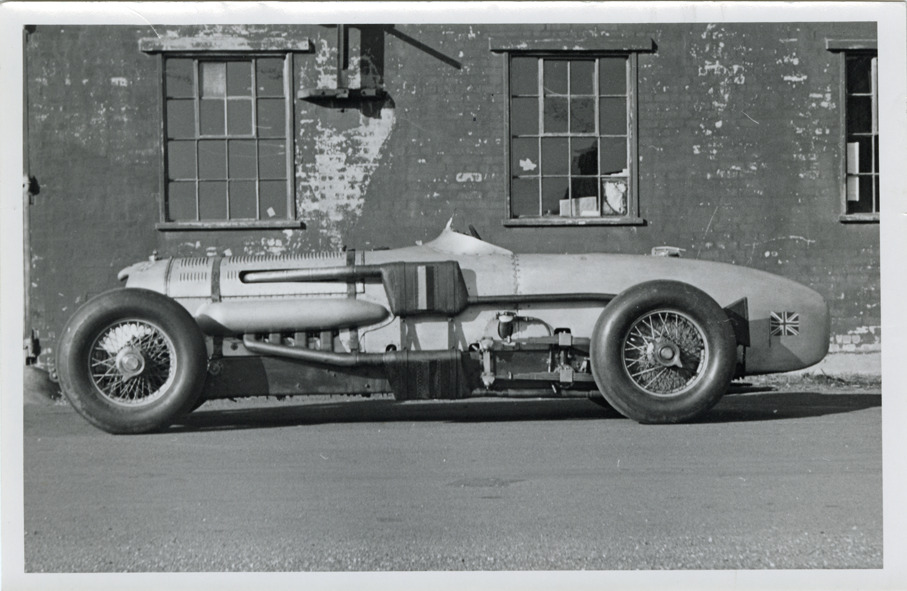 View of a 1934 Napier-Railton racecar. Handwritten on back: "Napier-Railton, 1934. The car has [undecipherable] fitted which were compulsory at Brooklands but I can fit the short pipes which we used on the Salt Flats if you prefer them. Weight of car [undecipherable] approx. 32 [undecipherable] or 3500 lbs. Engine develops 450 h.p.""