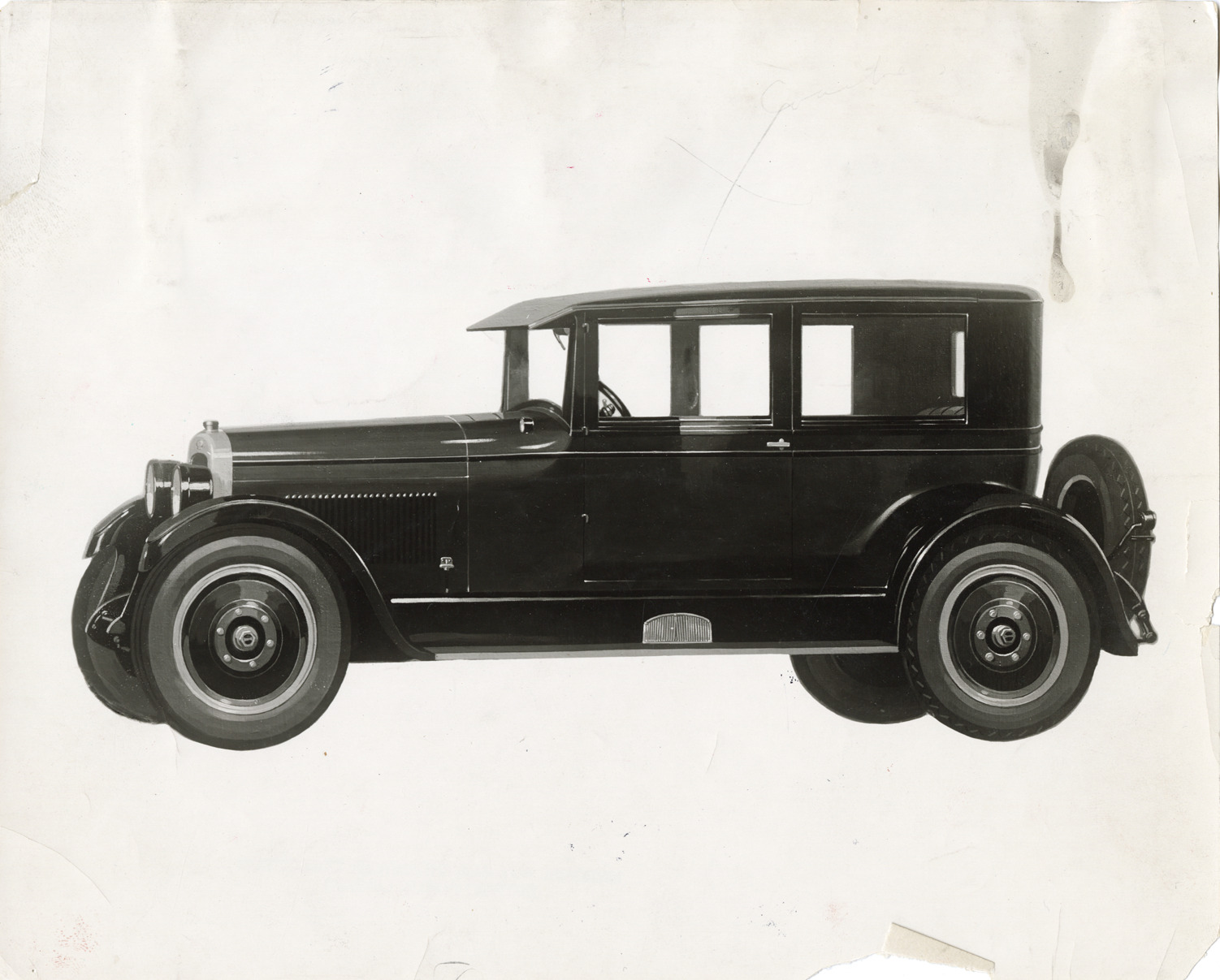 Artist's depiction of a 1925 Nash Model 163 sedan. Label on back: "The new 1925 Nash Advanced Six five-passenger sedan introduced at the New York Automobile Show is on the 121-inch wheel base chassis; its motor is equipped with full force-feed lubrication. Full balloon tires, four-wheel brakes and five disc wheels come as standard equipment. The body of the car is full stream line with beading encircling it." Handwritten on back: "Nash, 1925. Model 163, $1485."