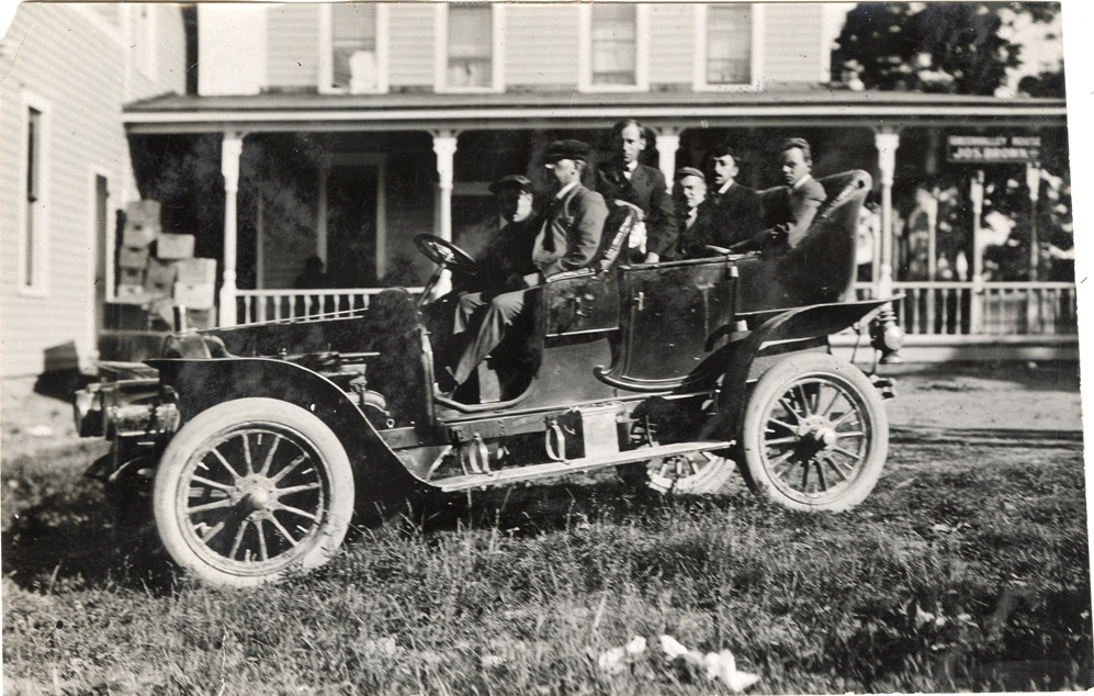 View of motorists posing in a National car. Stamped on back: "Spooner and Wells, 1931 Broadway, New York, duplicates any time, enlargements all sizes, tel. 3472-3473 Col., credit appreciated." Handwritten on back: "National, ca. 1908."