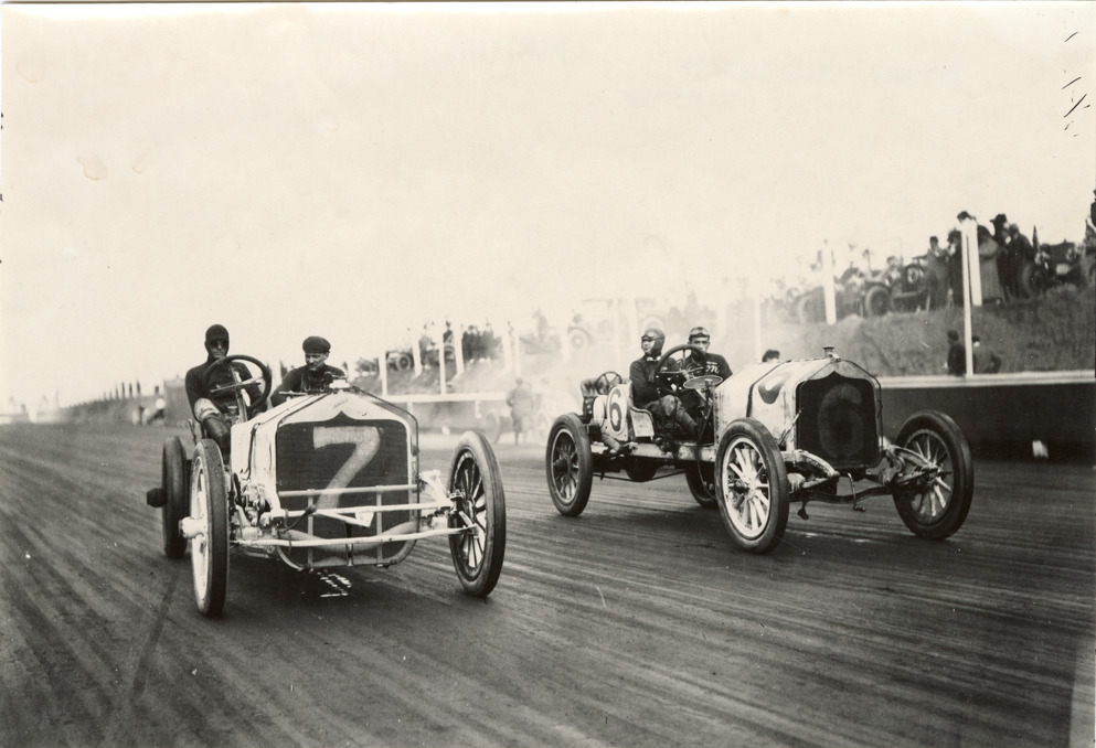 View of Tom Kincaid in National car no. 6 and Johnny Aitken in National car no. 7 at the Atlanta Speedway in Georgia. Handwritten on back: "No. 6, Kincaid, National. No. 7 Aitken, National. Atlanta, 1909. National, 1909."