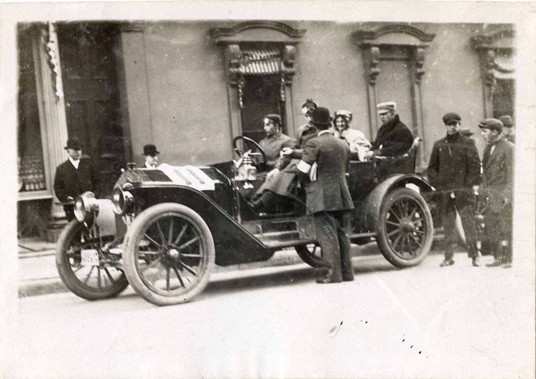 View of motorists in 1910 National car no. 11 during an unidentified event. Official stands next to car. Stamped on back: "Spooner & Wells, Inc., photographers, telephones 3472-3473 Columbus, 1931 Broadway, New York." Handwritten on back: "National, 1910."