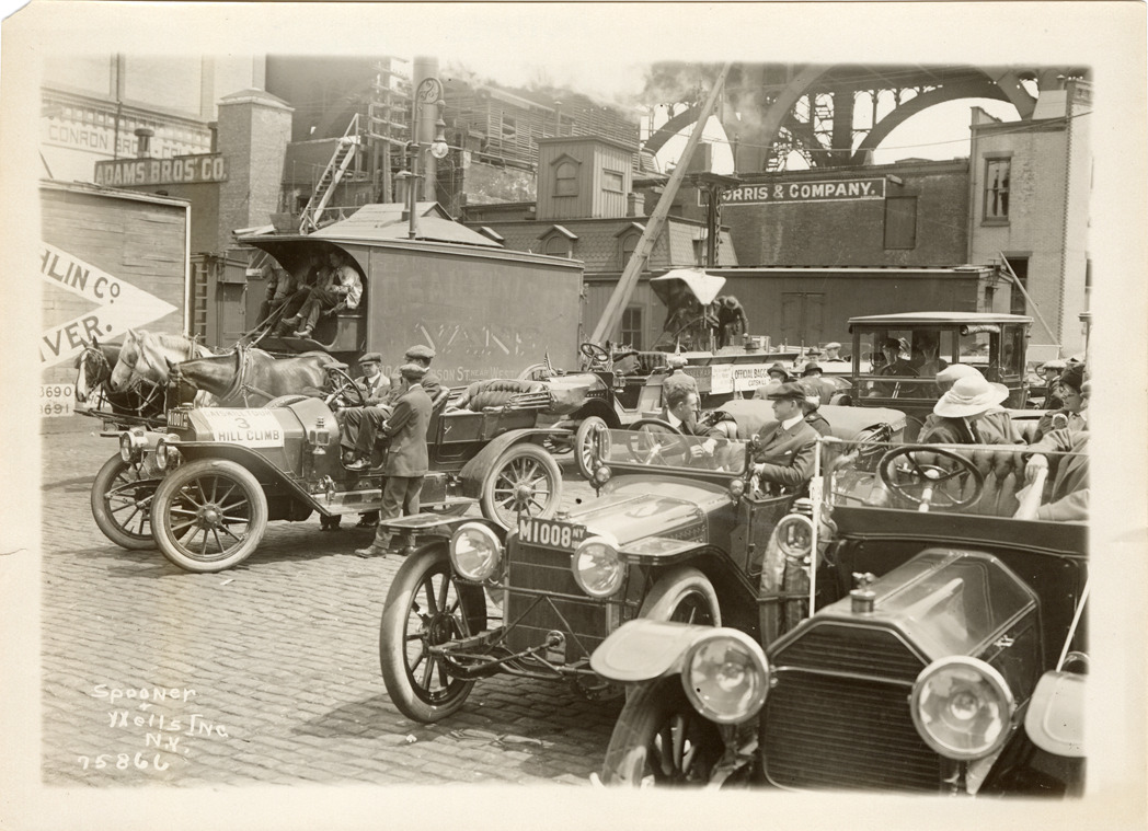 View of W.C. Poertner and passengers in National car no. 3 during the 1913 Catskill Tour and Hill Climb. The reliability run and hill climb covered a route from Edgewater, New Jersey to Catskill, New York and return. Unidentified cars in foreground; horse-drawn vehicle in background. Printed on front: "Spooner & Wells, Inc., N.Y." Stamped on back: "Spooner & Wells, Inc., photographers, 1931 Broadway, N.Y. City, phones 3472-3473 Col." Handwritten on back: "National, ca. 1910. Furthest car."