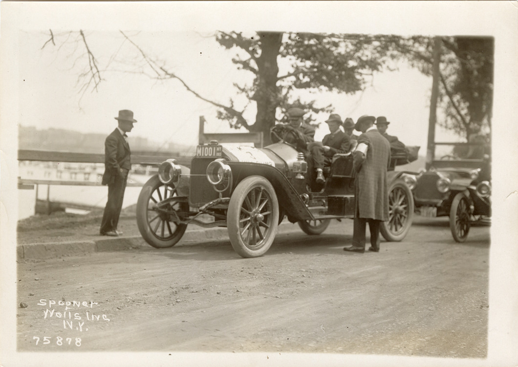 View of W.C. Poertner and passengers in National car no. 3 during the 1913 Catskill Tour and Hill Climb. The reliability run and hill climb covered a route from Edgewater, New Jersey to Catskill, New York and return. Printed on front: "Spooner & Wells, Inc., N.Y." Stamped on back: "Spooner & Wells, Inc., photographers, 1931 Broadway, N.Y. City, phones 3472-3473 Col." Handwritten on back: "National, ca. 1910."